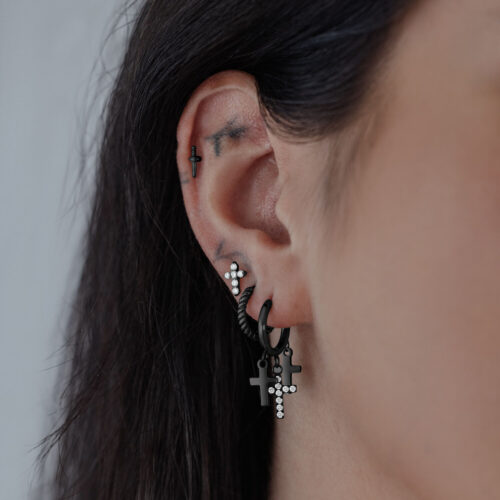 Steel Zirconline + 3 othersLittle Dangling Cross Hoops – Black Metal