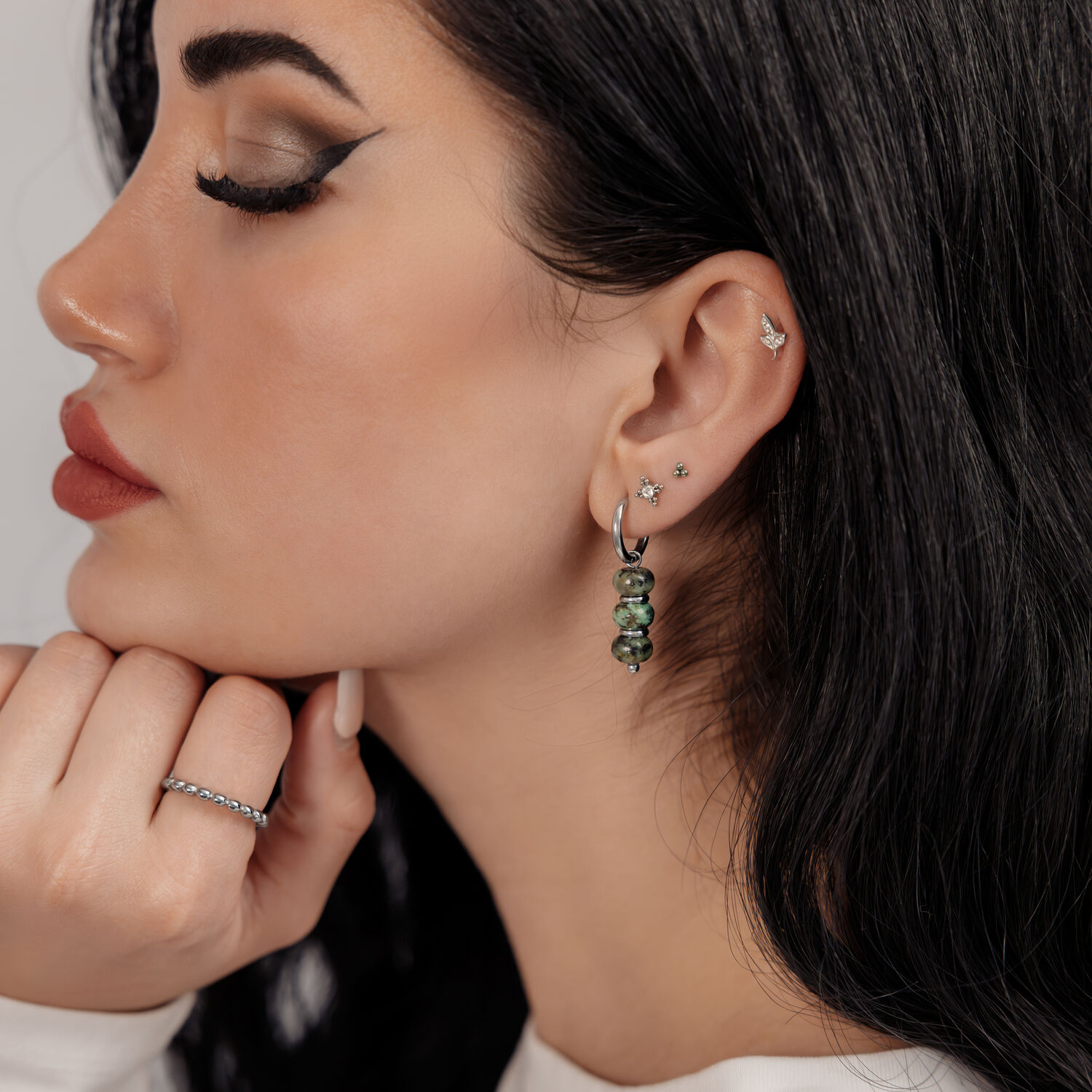 The African Turquoise Bubble Hoops feature a balanced combination of clean metal shapes and naturally inspired stone elements. Multiple rounded african turquoise beads are arranged vertically, creating a calm, organic look with subtle movement.