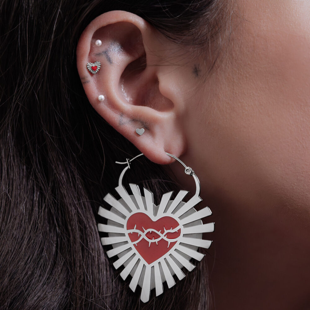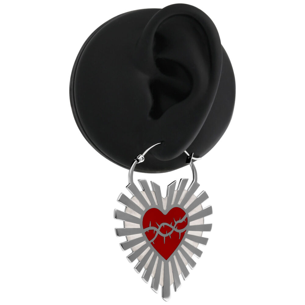 These unique earrings in the Sacred Heart design are a beautiful fusion of spirituality and modern style. The earrings take on the classic heart shape and give it a powerful expression with a striking detail. Inside the heart is an intense red heart, surrounded by fine barbed wire at its center – a symbolic motif representing both strength and protection.