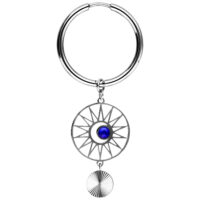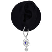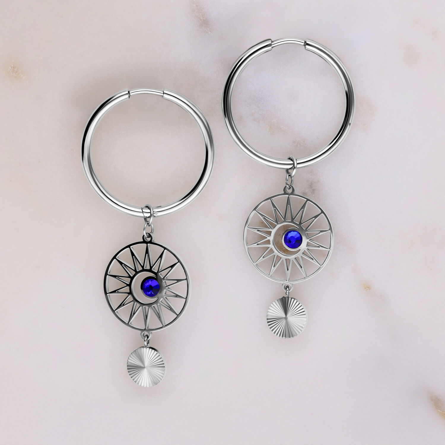 The Celestial Orbit Hoops feature a bold, cosmic-inspired design. A round pendant with a radiant, sunburst-like structure frames a blue zirconia crystal at its center. An additional finely crafted dangling element adds movement and depth to the overall look.