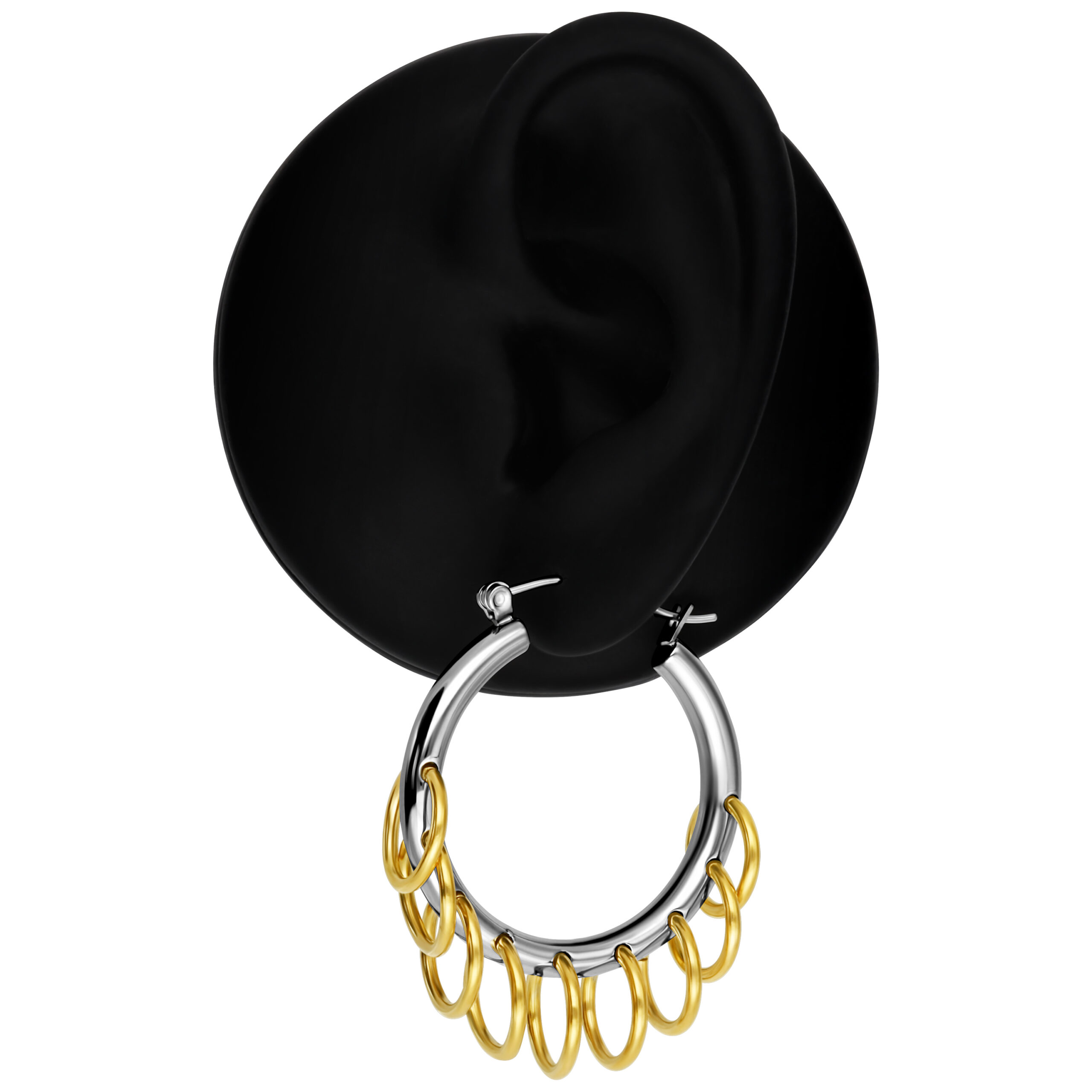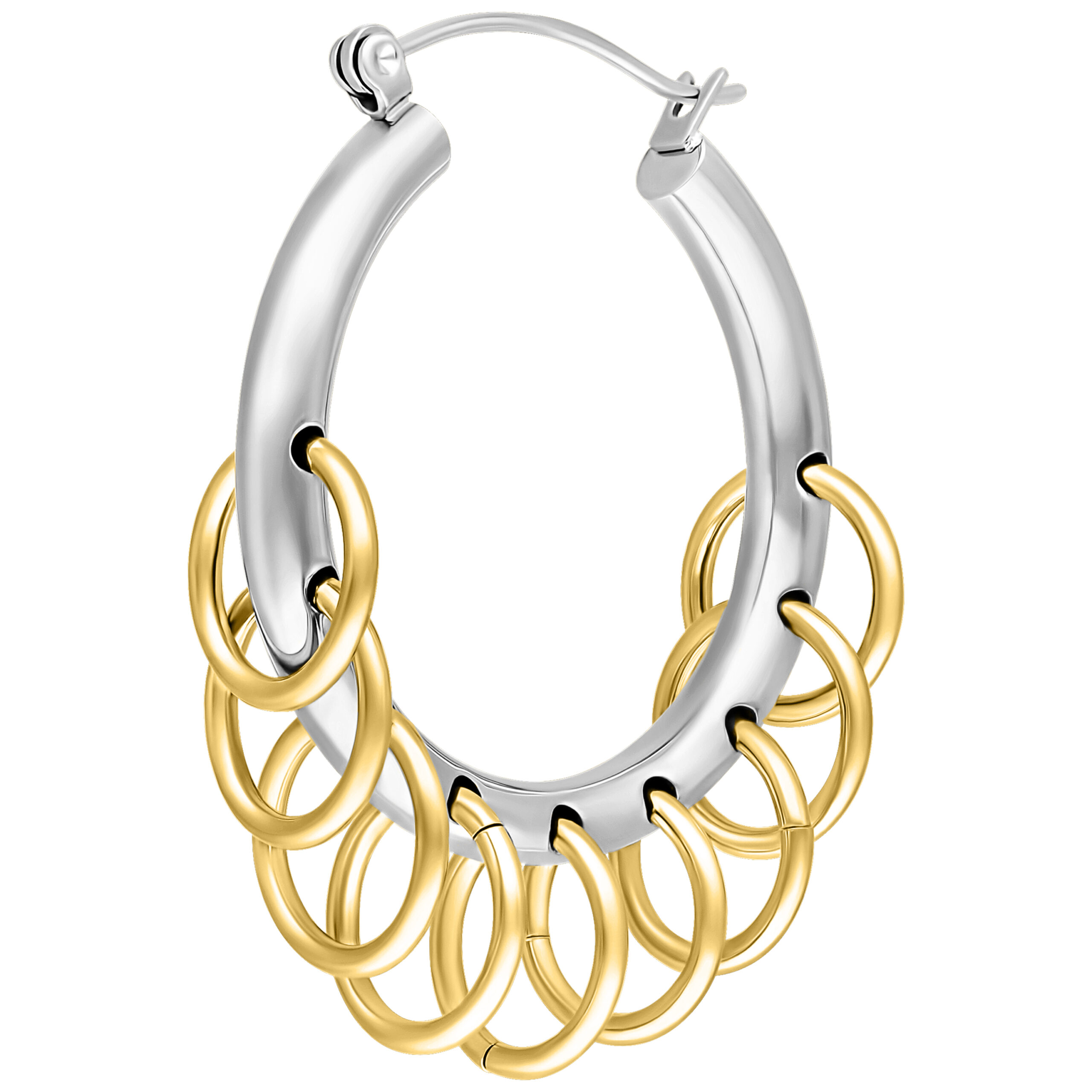 Our extravagant hoops with loops create a trendy look that’s a bit different! The large earrings are adorned with small rings and combine two different metal colors with an edgy punk style.