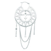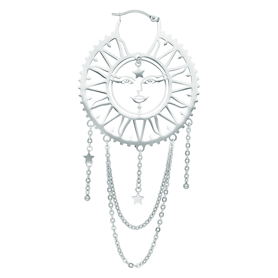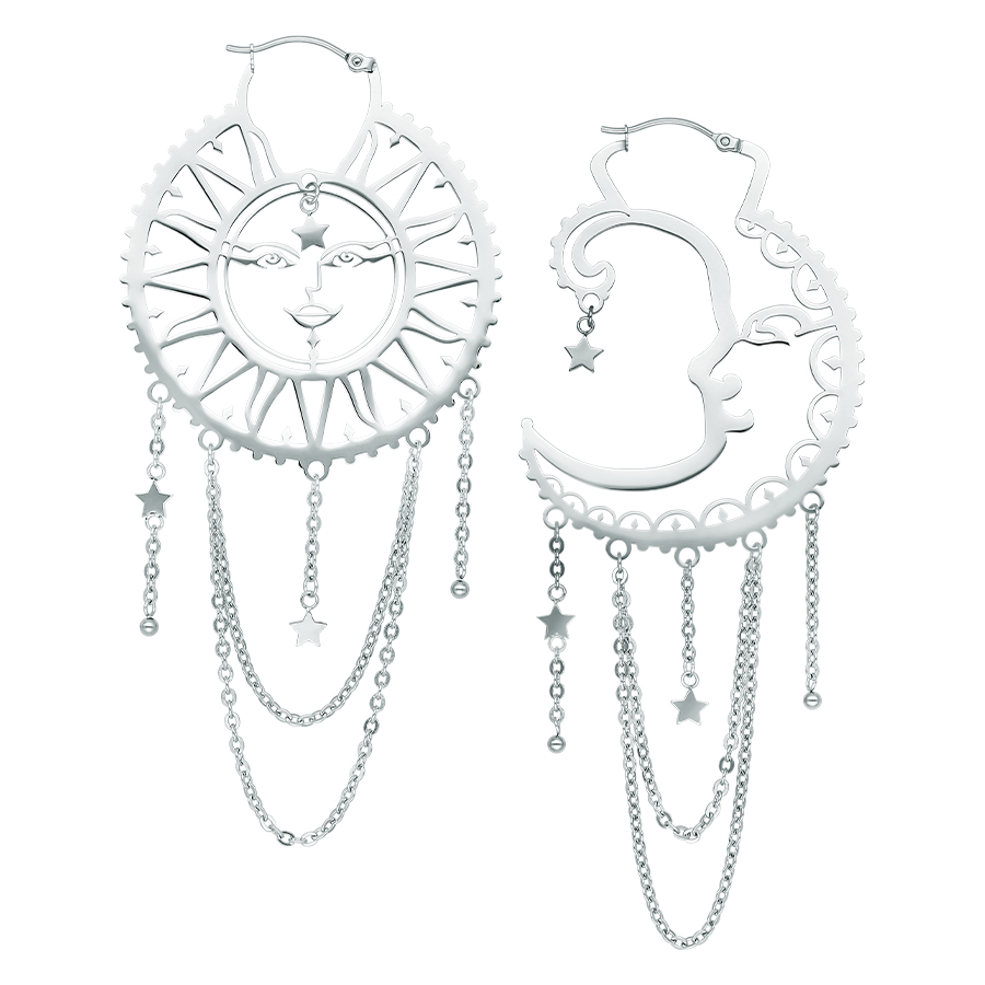 The power of the moon – the sun as living donor!nnThe sun symbolizes life and represents the highest cosmic force. The sun motive depicts the ensign of life and its endorsement. It stands for the process of life and for something that permanently recurs due to the steady sunrise and sunset. Therefore, it also stands for resurrection and recommencement.nnOn the other hand, the moon is not only able to exert influence on the tides, which in turn causes ebb and flow, but it is also able to exert influence on us human beings. Due to its apparent brightness, the moon has been assigned with a special meaning in all kind of mythologies. Amongst others, the moon is regarded as the star of the night, the feminine counterpart of the sun, while the sun is regarded as the masculine god and the star of the day.nnWe all have features of the sun and the moon inside us. Therefore, these hoop earrings consists with intent of a moon and a sun to represent their opposed force and the cycle of life and to help us to find our inner balance.nnThese beautiful, silver-coloured hoops are made of high-quality stainless steel and are sold pairwise. They can be worn in your normal lobes as well as in your tunnels. The pin of the hoops is 1.0 mm thick and the hoops have a height of 50 mm and a width of 50 mm.