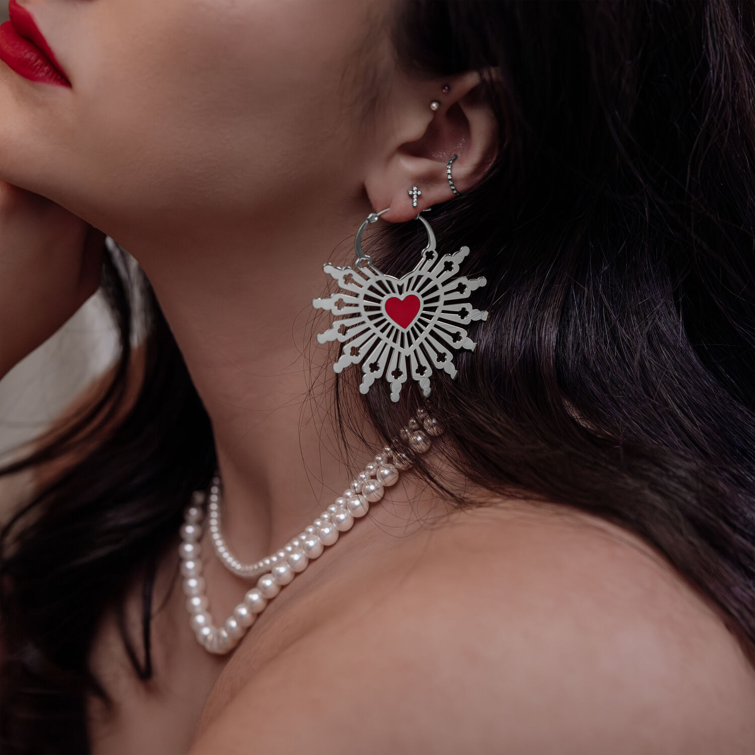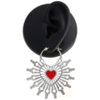 These unique earrings combine powerful symbolism with artistic design. At the center of the Sacred Heart Hoops is a vibrant red heart, symbolizing the passion and love of the Sacred Heart. From this heart, an elegant pattern unfolds, reminiscent of the intricate stained glass windows of a church – delicate lines and details that create a connection between spiritual depth and modern style.