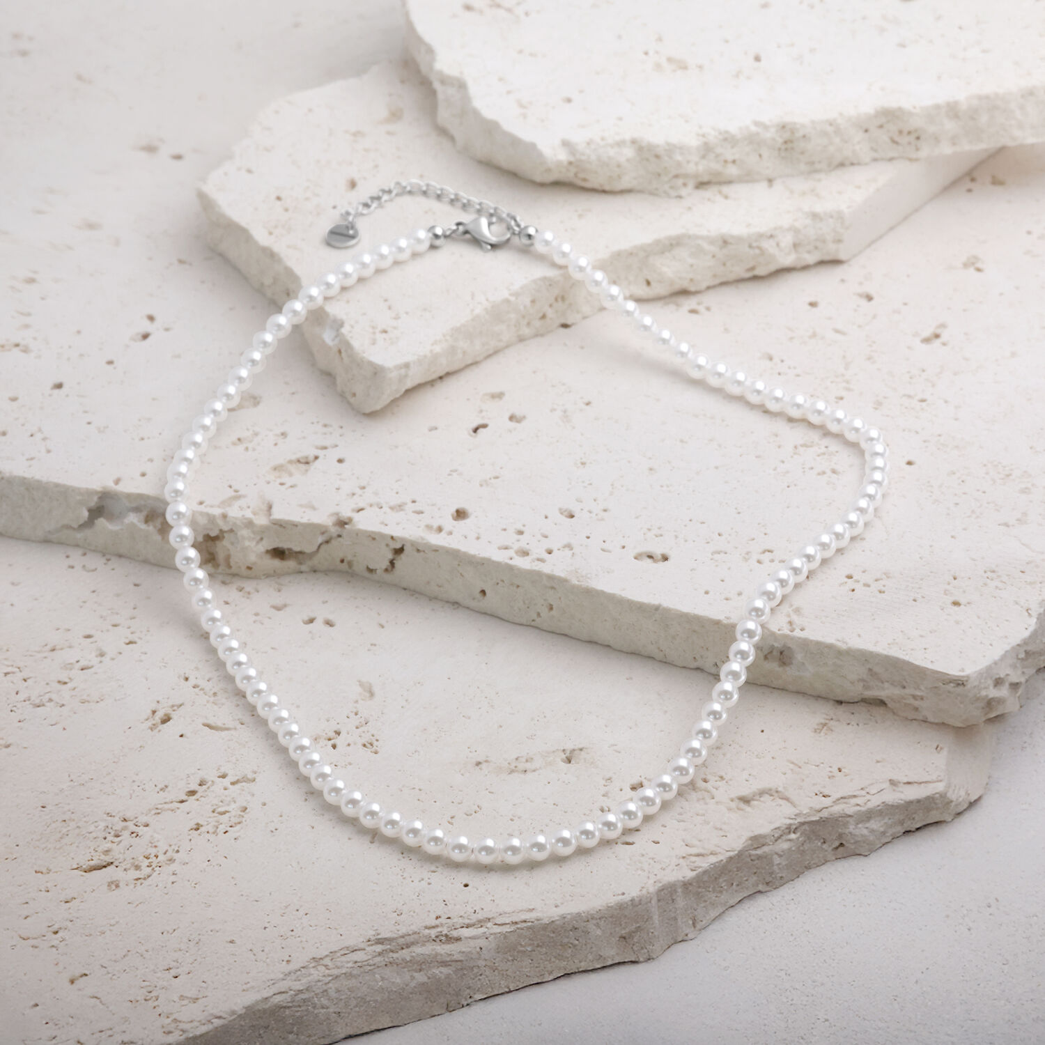 This elegant pearl necklace, crafted from high-quality 316L surgical steel, combines timeless design with lasting quality. The perfectly polished synthetic pearls, with a diameter of 4 mm, are available in sophisticated silver or warm, shimmering gold, adding a stylish accent to any outfit. Made from nickel-free, skin-friendly material, the necklace offers exceptional wearing comfort and retains its elegant shine even with daily use. Thanks to its minimalist, unisex design, it can be styled in countless ways – whether as a fashionable highlight for everyday wear or as an elegant companion for special occasions. Perfectly complemented by other pieces from our collection, it’s sure to become your personal favorite accessory.