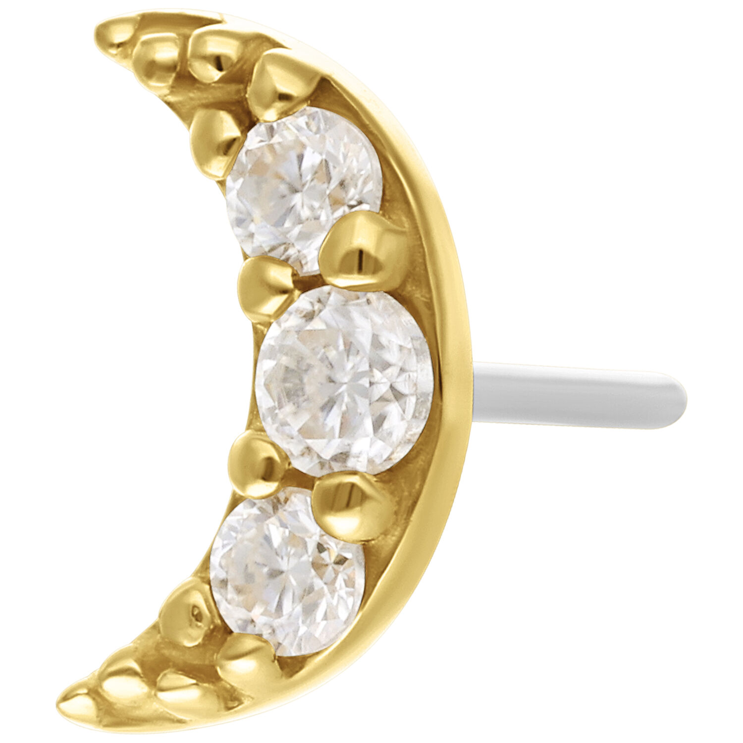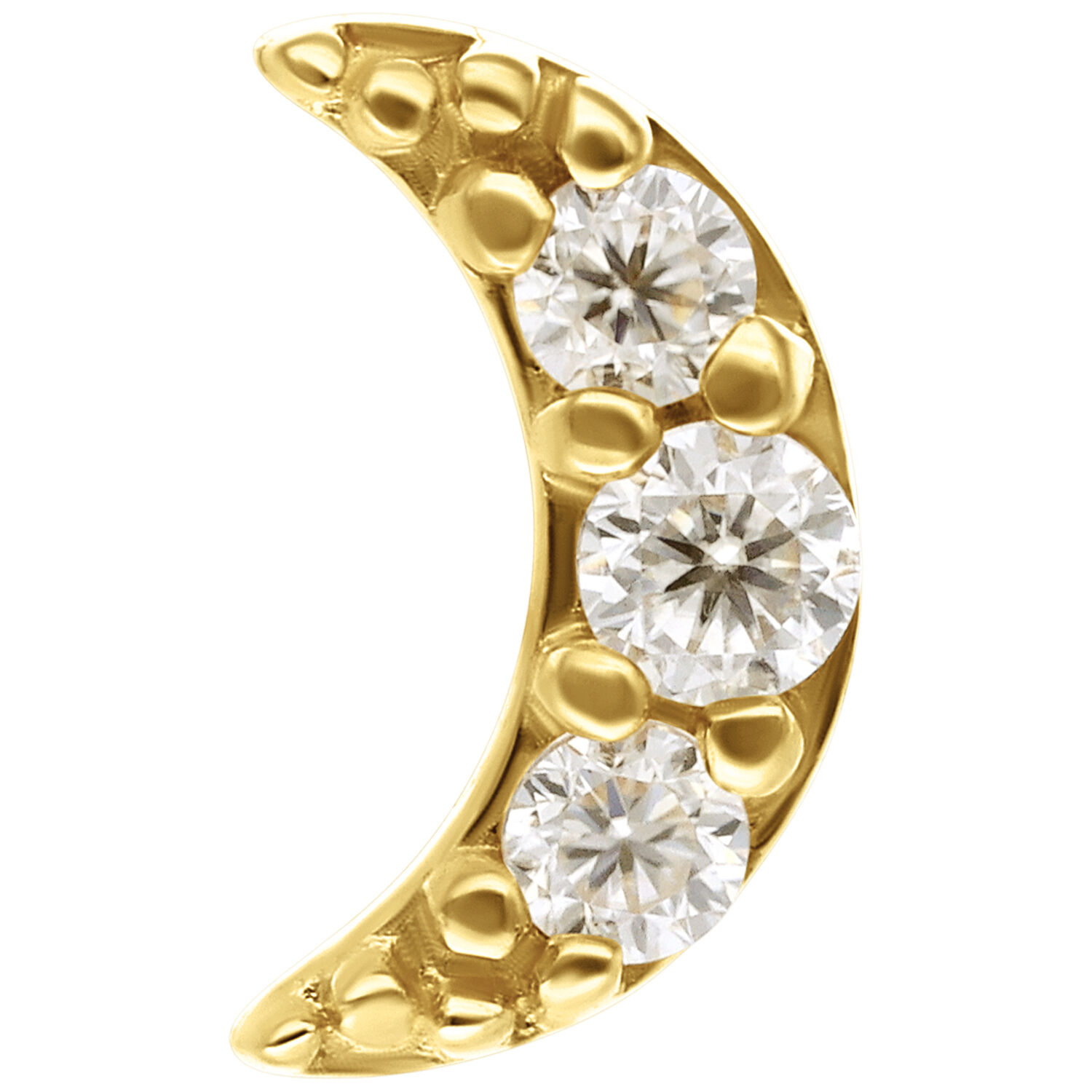 The elegant 14K Gold Push-Fit Moissanite Moon Attachment adds a subtle celestial sparkle to any piercing. Its delicate moon shape is enhanced by a brilliant moissanite stone that reflects light beautifully, giving the piece a refined and mystical appearance.