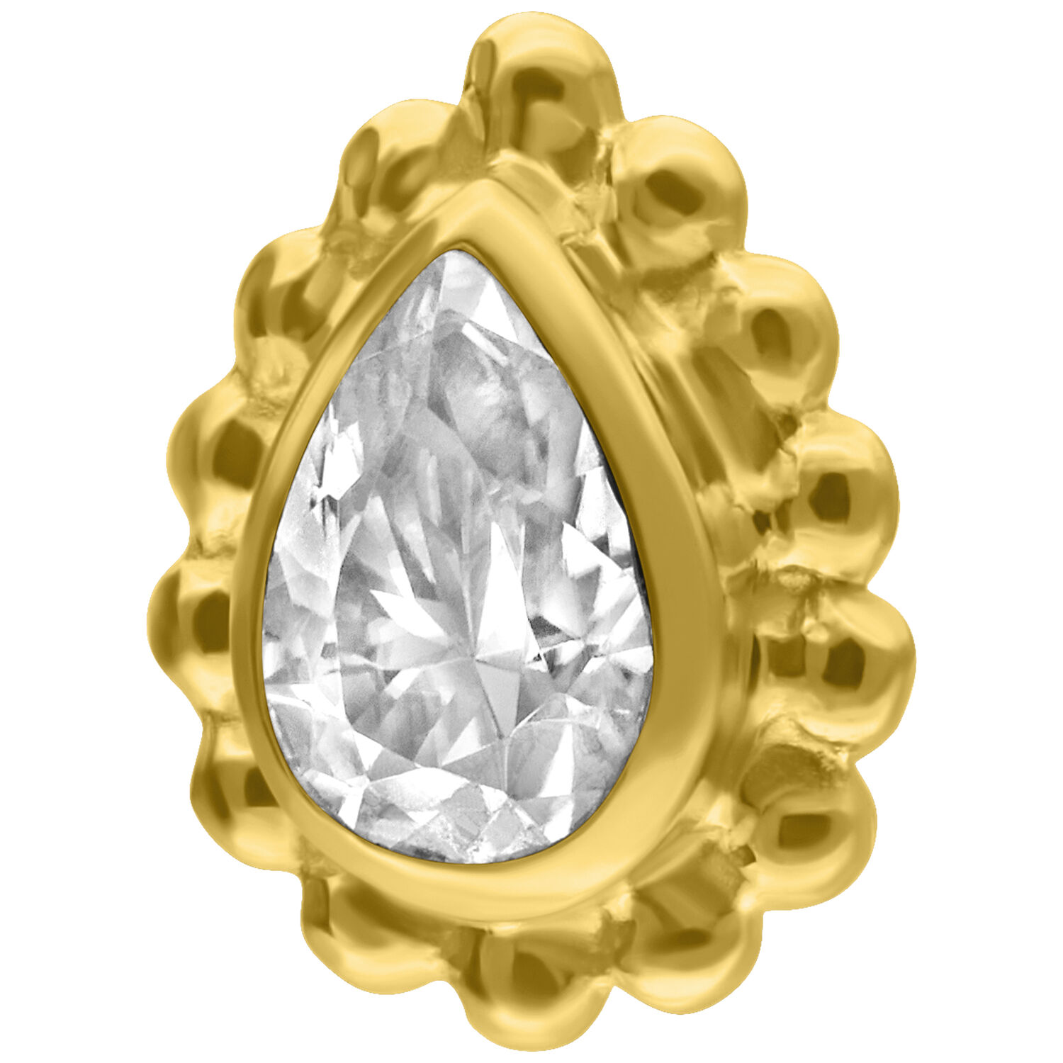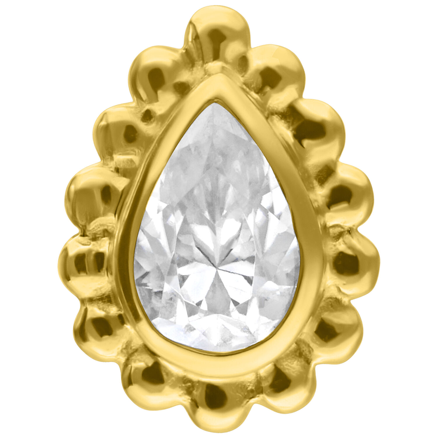 The Crystal Drop Attachment from the Wildcat Collection pairs polished 14 karat (585) yellow gold with a sparkling, teardrop-shaped crystal. Designed specifically for the Perfect Fit Labret (14K), this elegant and feminine piece measures 3.7 x 4.9 mm and weighs 0.14 g. A true eye-catcher that offers both luxurious style and lightweight comfort.