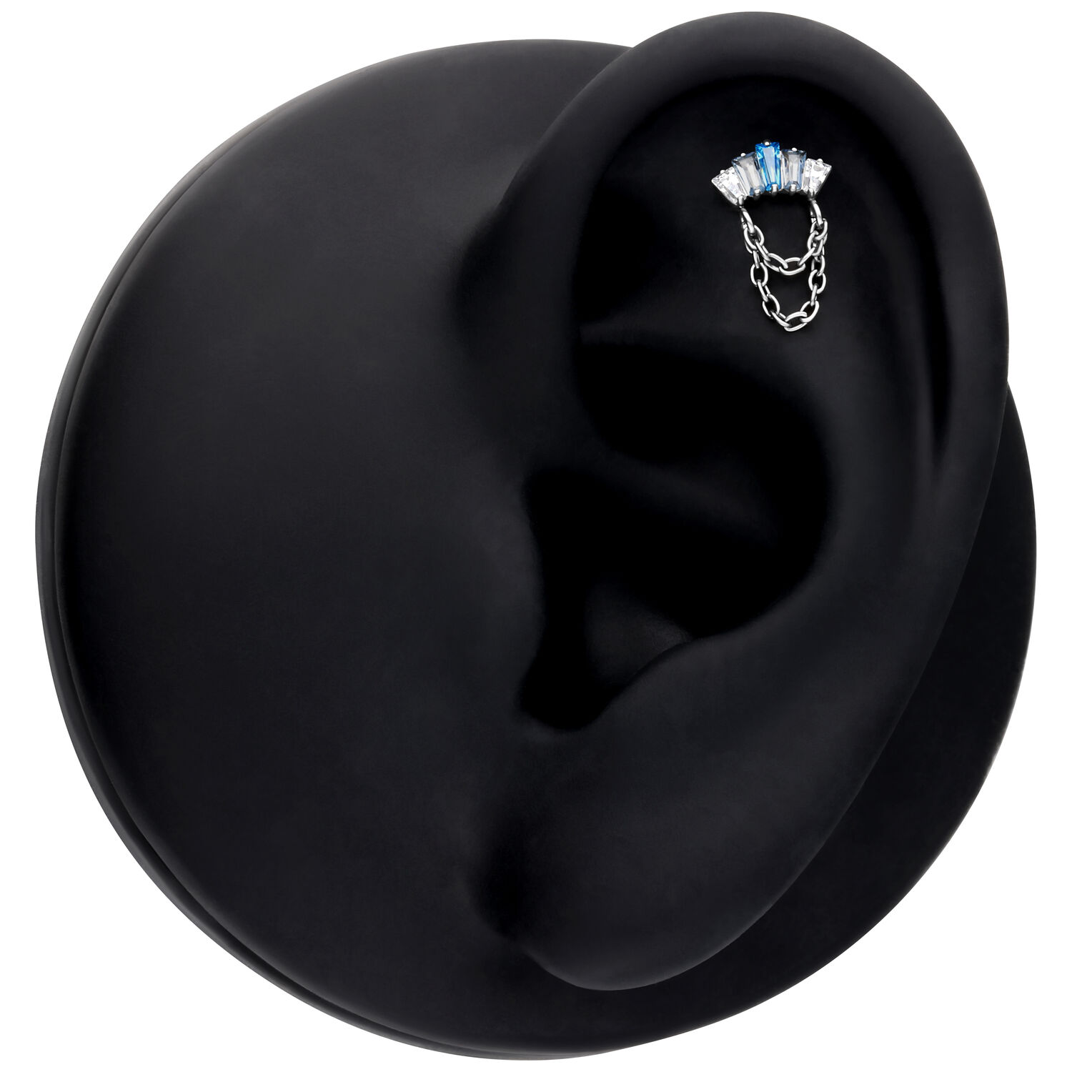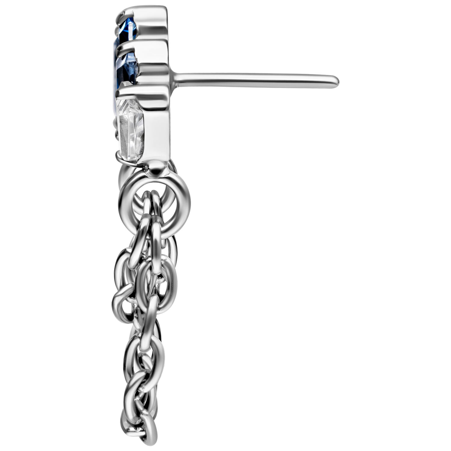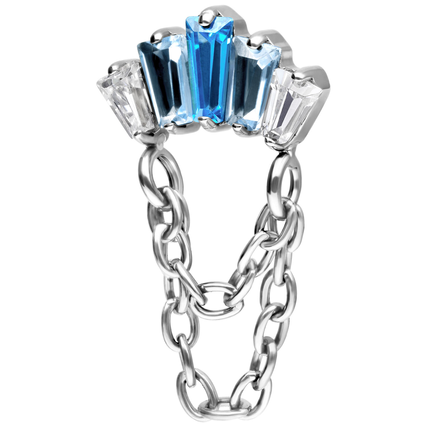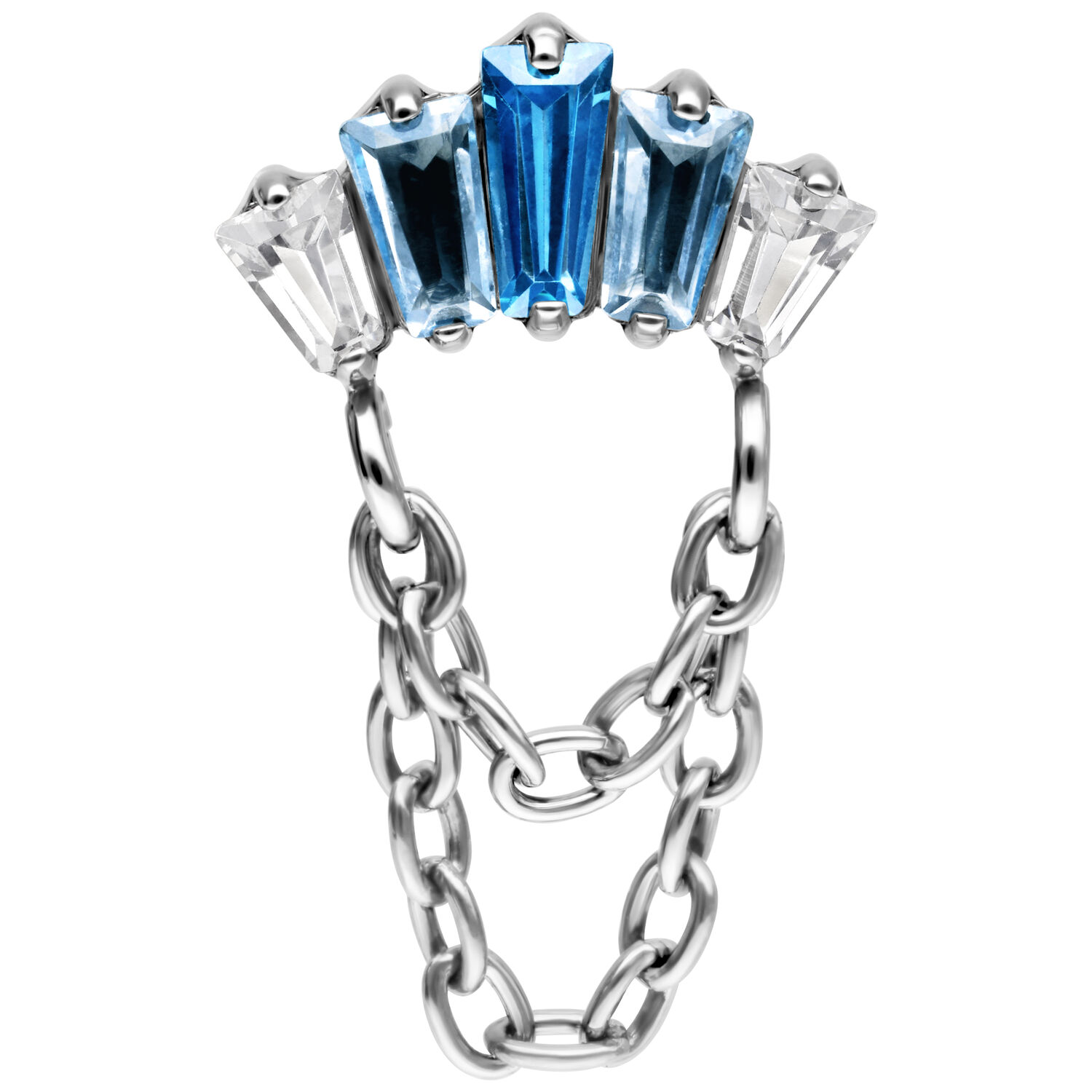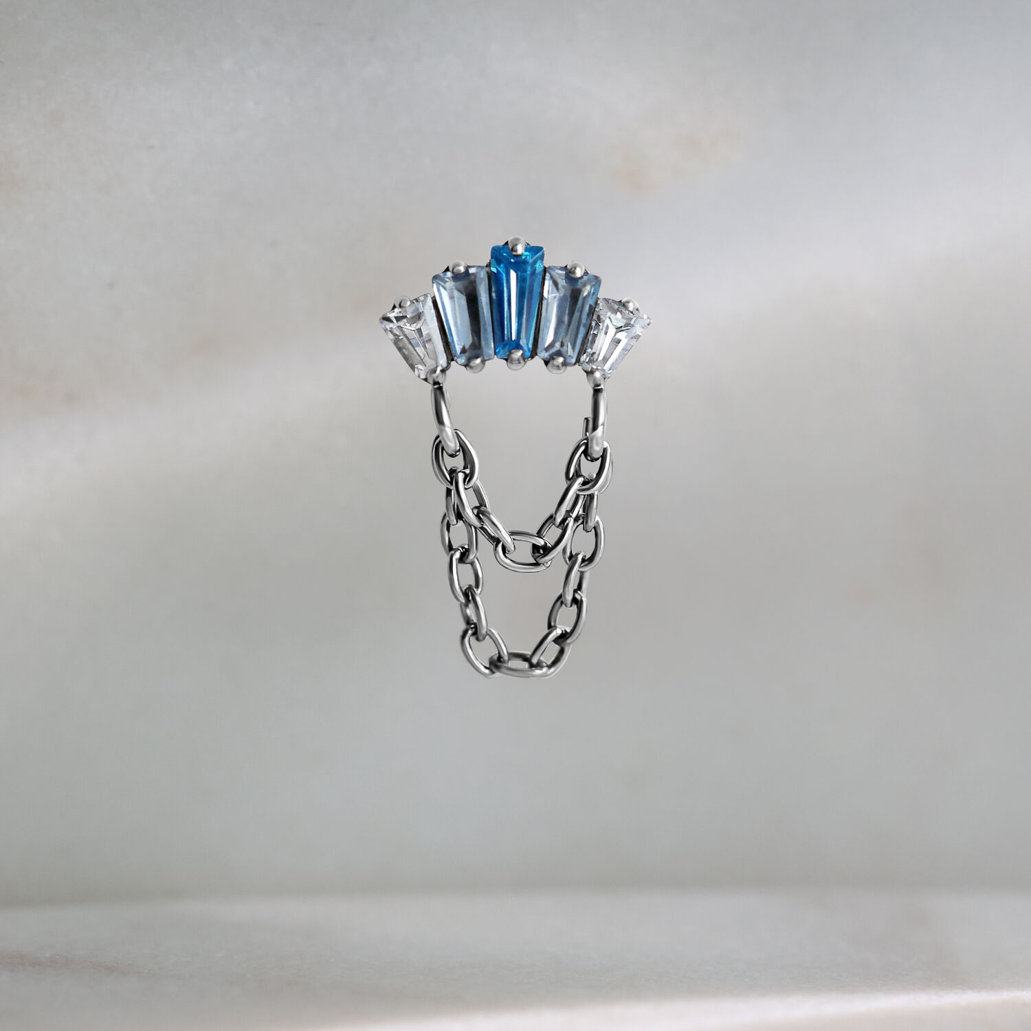 The crystals in turquoise and lavender bloom in a delicate arrangement, catching the light with every movement. Two fine chains in sleek silver or luxurious gold complete the design, adding a flowing, luxurious touch that immediately draws the eye and gives your piercing an unforgettable depth.