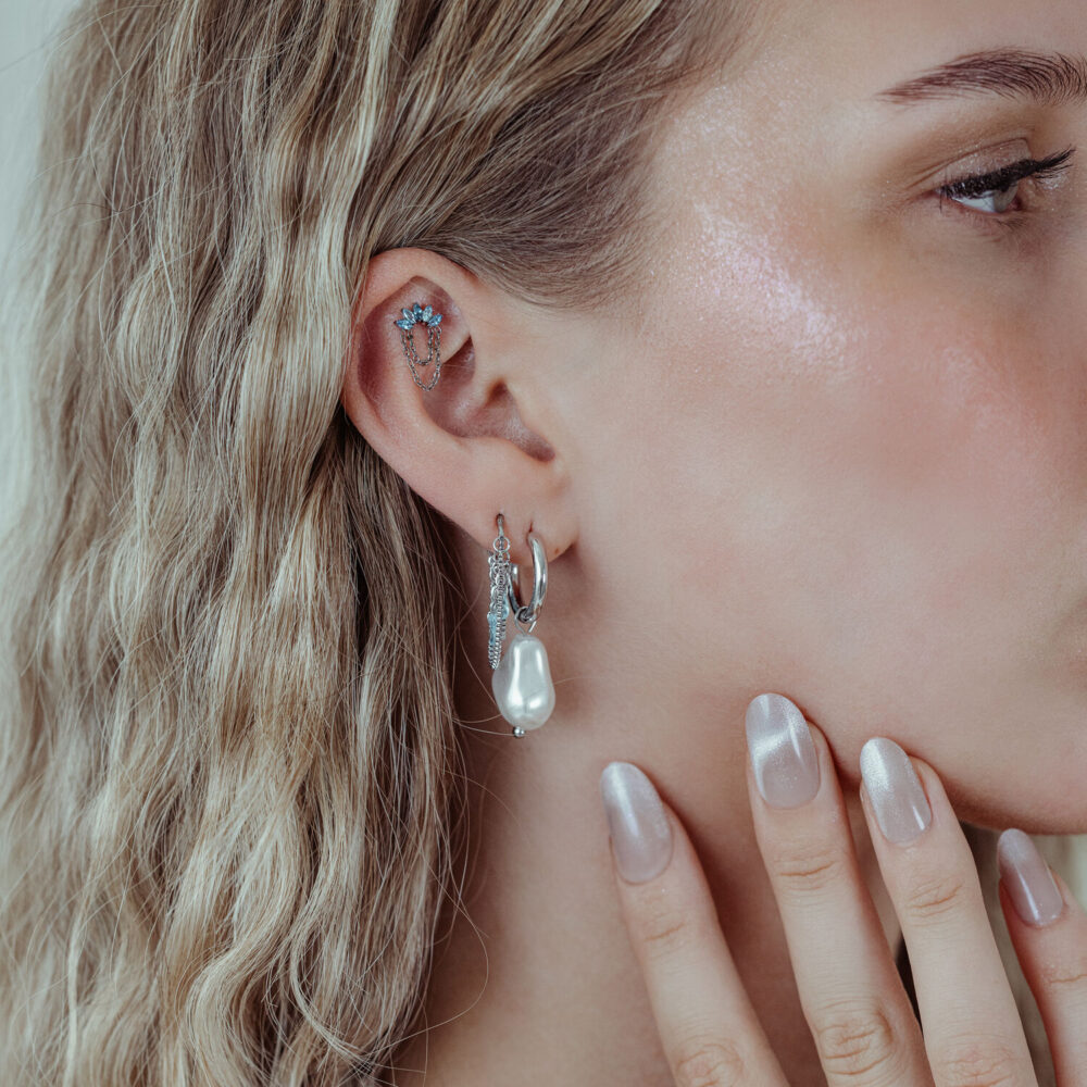 The crystals in turquoise and lavender bloom in a delicate arrangement, catching the light with every movement. Two fine chains in sleek silver or luxurious gold complete the design, adding a flowing, luxurious touch that immediately draws the eye and gives your piercing an unforgettable depth.