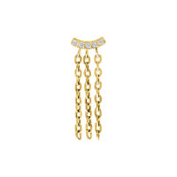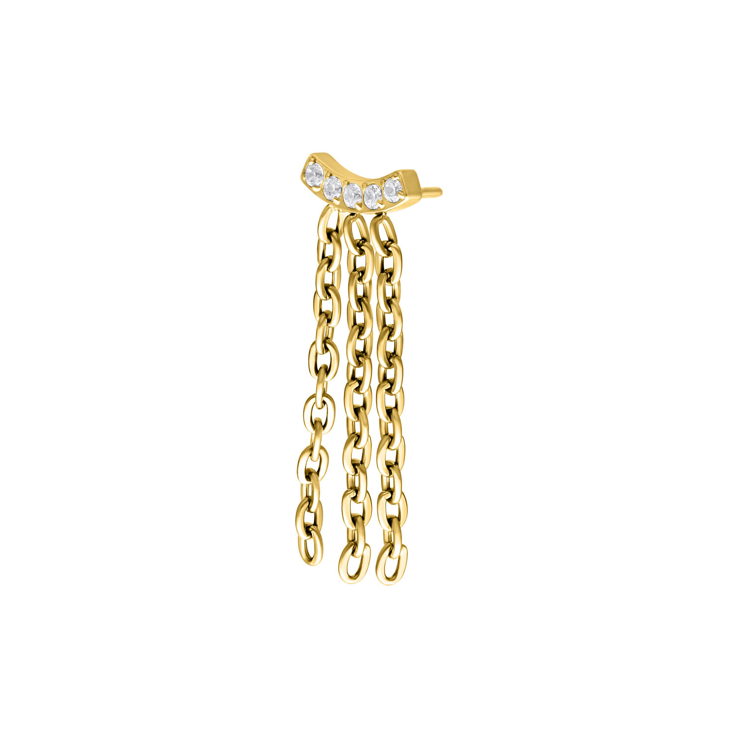 Are you looking for a touch of shine and attitude? Our Push Fit Crystal Bar Chain Attachment with sparkling crystal arch and cascading chains is a statement piece that immediately catches the eye. The fine chains elegantly hang from your ear, giving this piercing an edgy yet playful vibe. A perfect expression of individuality and style.