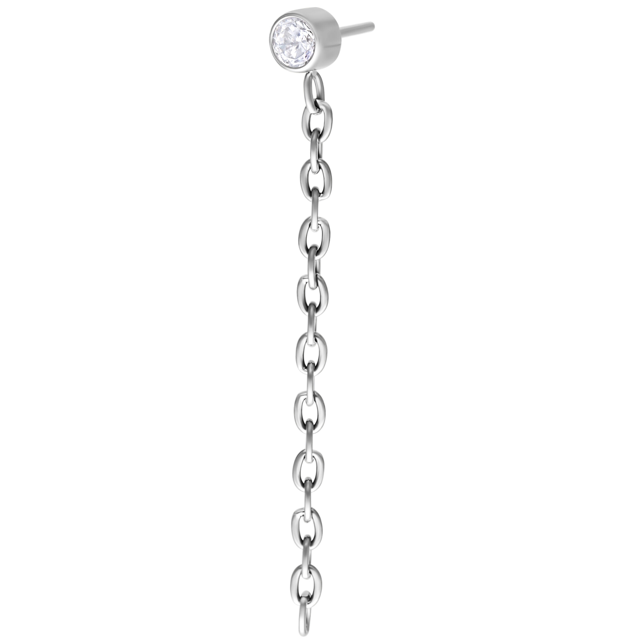 Are you looking for a touch of sparkle and attitude? Our Push Fit Attachment with a shimmering crystal and cascading chains is a statement piece that immediately catches the eye. The fine chains hang elegantly from your ear, adding an edgy yet playful touch to the piercing. It’s a perfect expression of individuality and style.