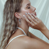 The sparkling crystals in turquoise and lavender resemble precious jewels of the deep, capturing the light with every movement and making you glow. Paired with sleek silver or luxurious gold, this design immediately catches the eye and adds an irresistible aura to your look.