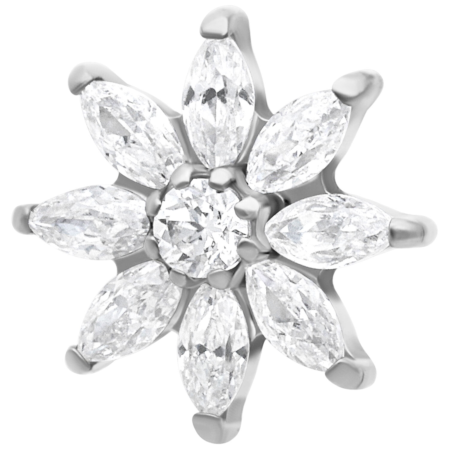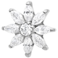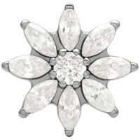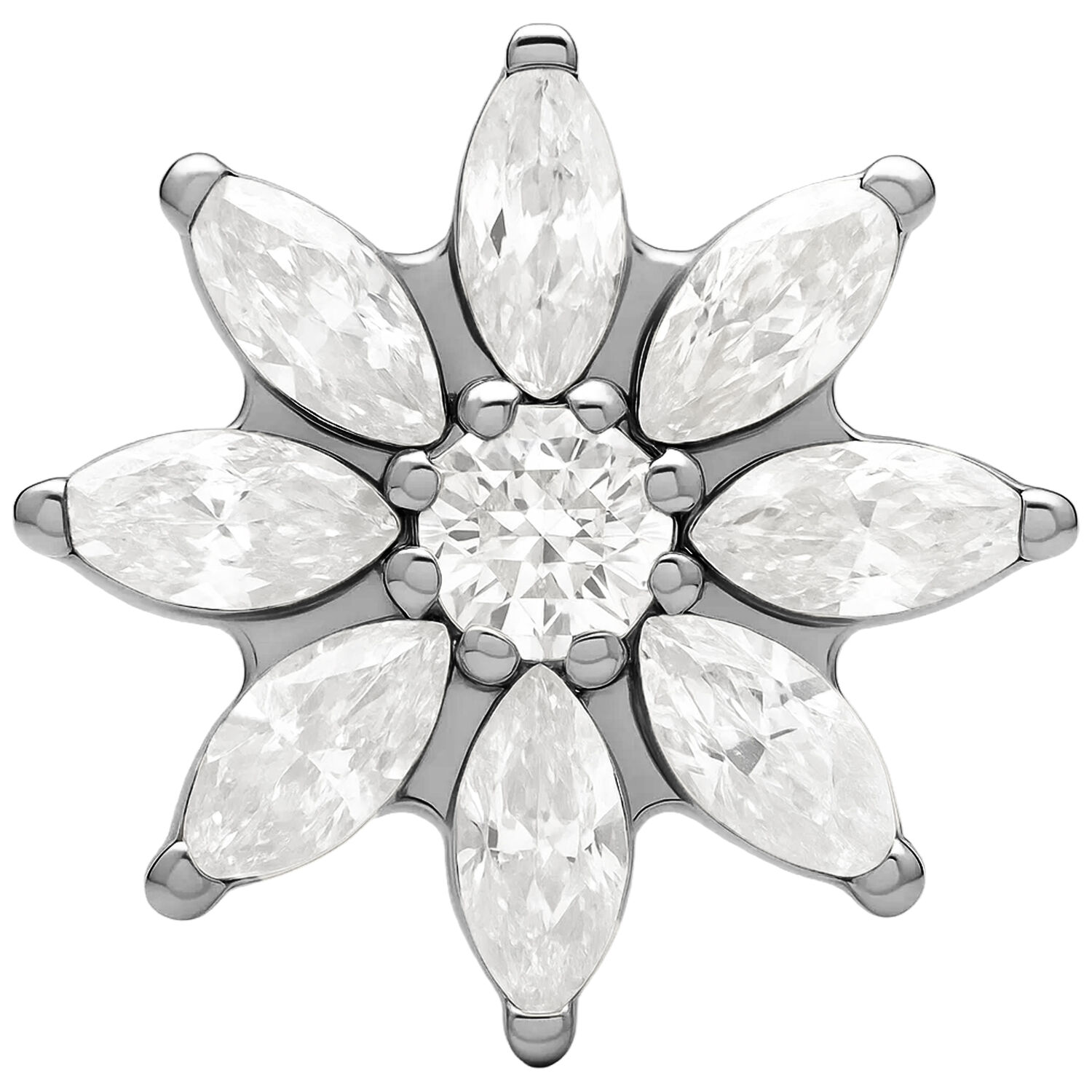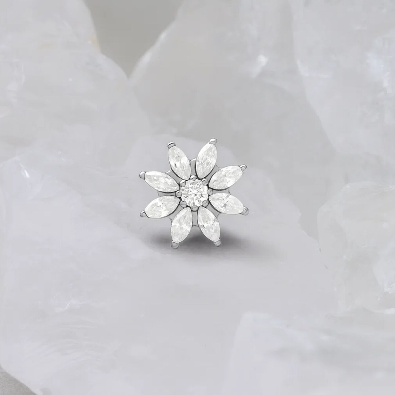 The Winter Crystal Ice Flower attachment adds a bright, frozen sparkle to your piercing. Its delicate floral shape paired with shimmering crystals evokes the look of frosted petals, catching the light beautifully. Crafted from premium Grade 23 titanium (G23), it ensures excellent biocompatibility and long-lasting comfort.