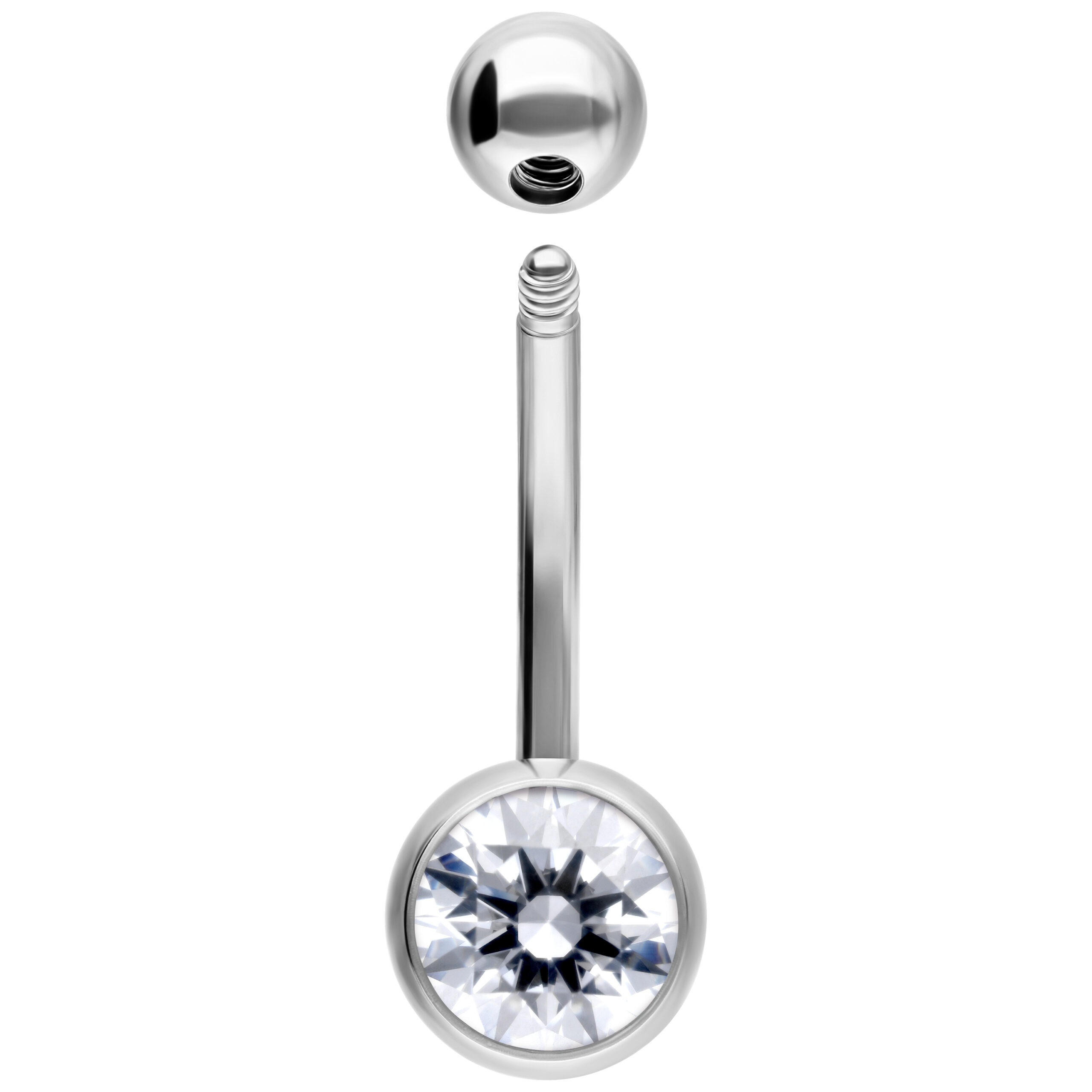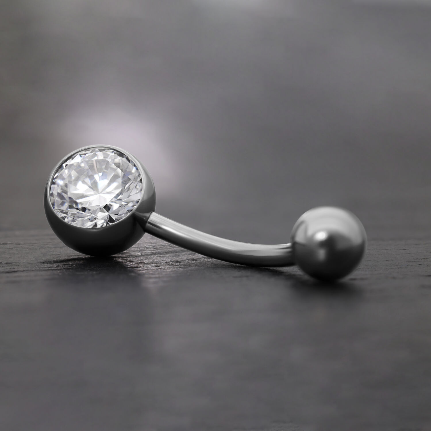 The BYCG Jewelled Bananabell with a bar thickness of 1.6 mm is available in lengths of 10.0 and 12.0 mm including a large ball (8.0 mm) and a small ball (5.0 mm). Both balls are set with a precious crystal. The piercing is available in the crystal colours Crystal Clear, Fancy Champagne, Fancy Morganite and Greyish Blue.