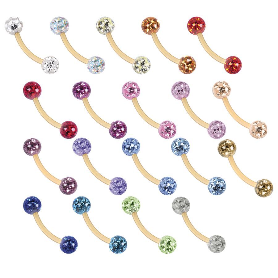 Gold belly bar with multi-jewelled balls, eyebrow and female genital piercing. This jewellery is suitable for eyebrow and female genital piercings in size 1.2 mm bar thickness. For navel piercings, the 1.6 mm bar thickness is suitable.<