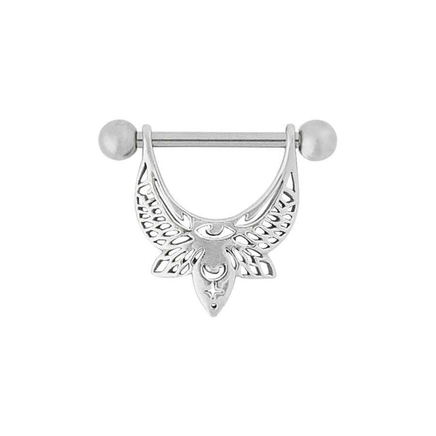 The mystical nipple barbell with a shield for your nipple consists of two separate parts. The barbell, made of 316L stainless steel, has an overall length of 14 mm, but when the shield is attached, the total length is 12 mm. The loops through which the barbell is inserted have a fixed distance. The shield is designed in a delicate moth shape.