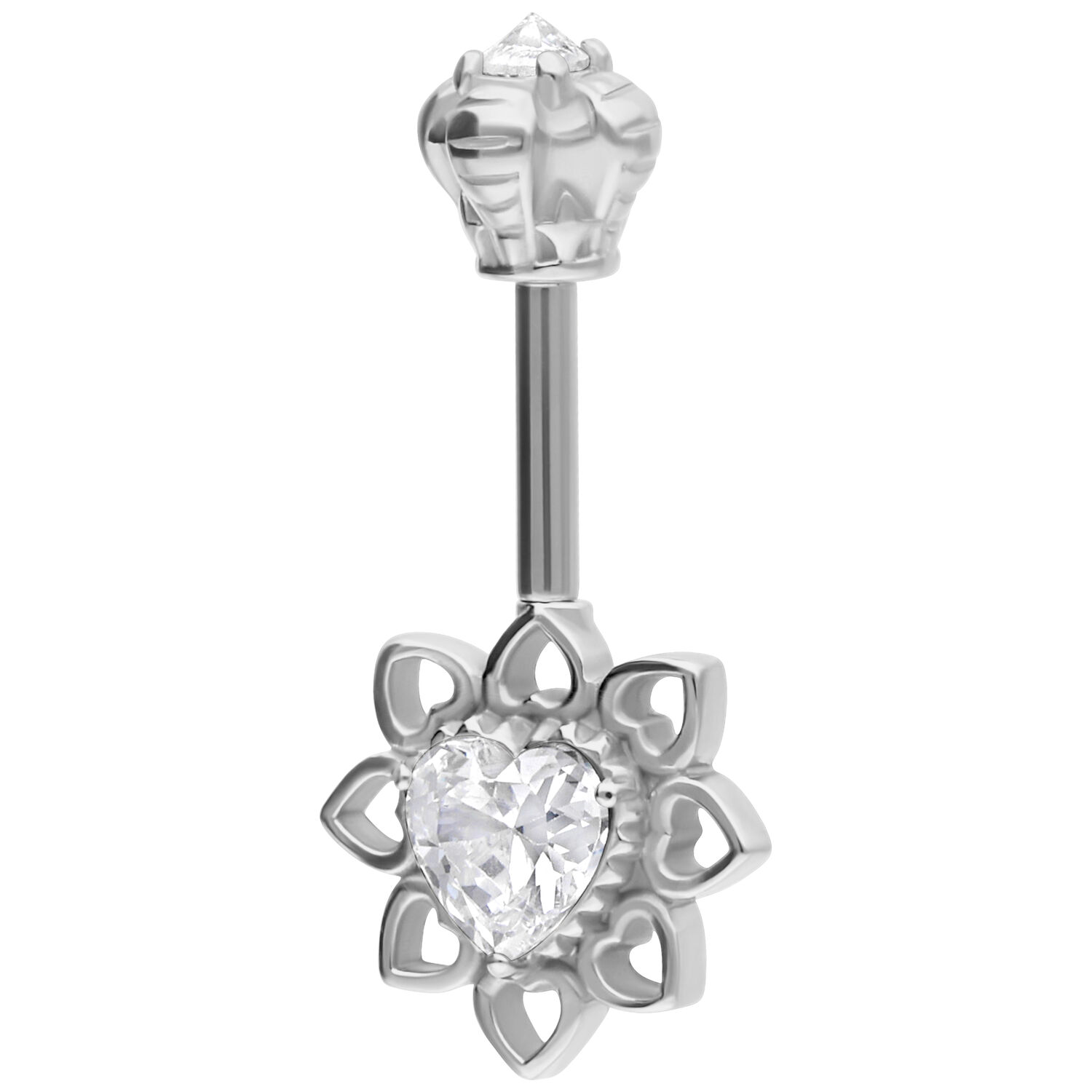 This lovingly crafted piercing jewelry for the vertical helix enchants with a playful, heart-inspired design. At the center sits a sparkling, heart-shaped zirconia, surrounded by a delicate floral structure made of open heart elements – a symbol of love, elegance, and individuality. The internally threaded top piece is intricately designed, resembling a floral crown – perfect for those who appreciate romantic details.