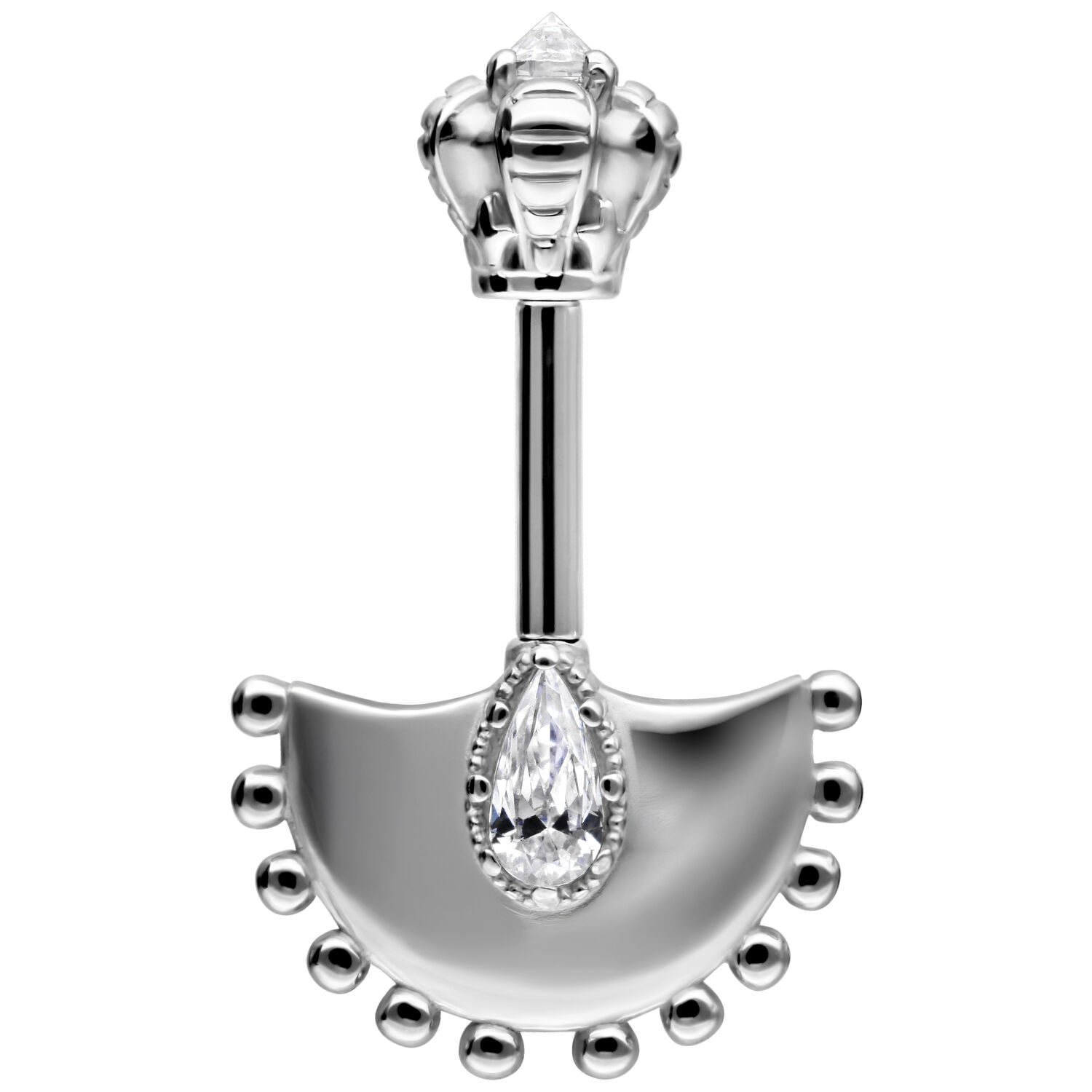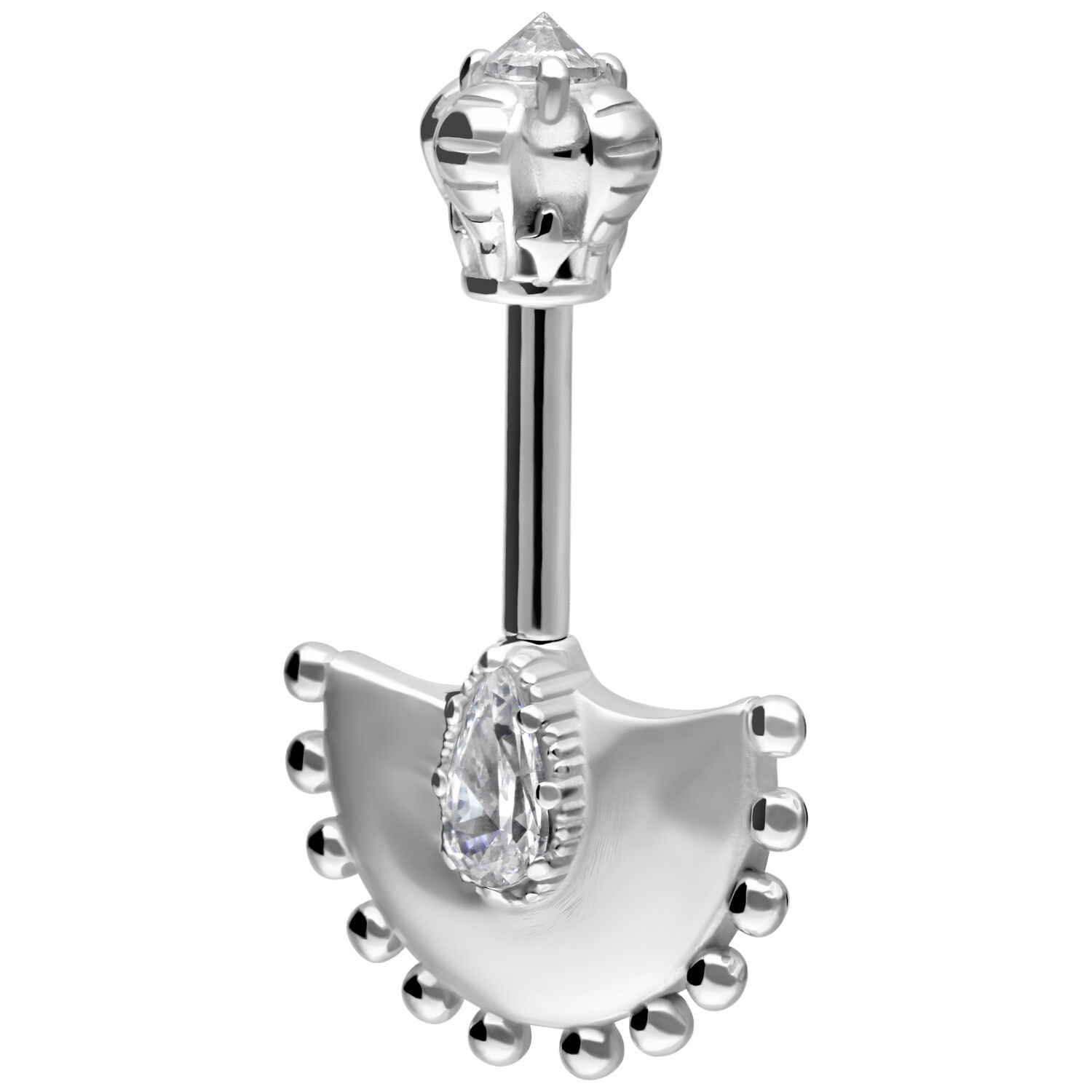 This unique piercing jewelry for the vertical helix stands out with its modern and intricate design. At the center sits a sparkling teardrop-shaped zirconia, set into a half-circle element adorned with symmetrically arranged bead details along the lower edge. The internally threaded top piece is elegantly crafted and complements the overall look – a true eye-catcher for those who appreciate distinctive jewelry.