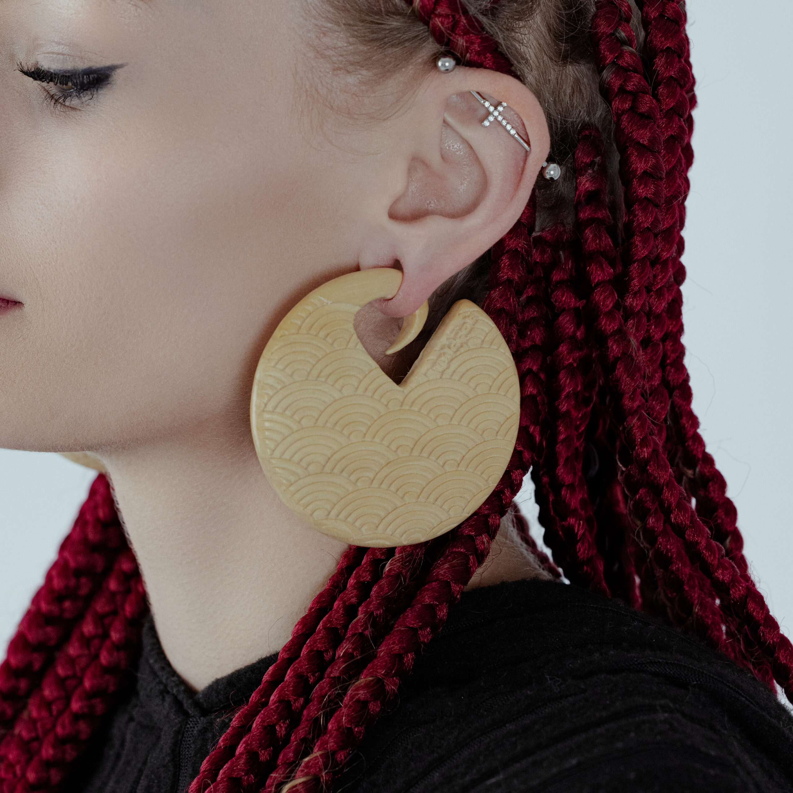 Are you looking for the perfect piece of jewellery for your stretched ears? Our new organic wood weights are for you! 100% handcrafted and made in Bali, these organic wood weights have a light coloured design on both sides for perfect visibility! Wear them with or without your dilated lobe tunnels! Unlike our tunnels, these wooden weights are sold in pairs! The beautiful and light crocodile wood meets the highest Wildcat quality standards. From an ecological point of view, but above all, a dermatological one, it is the perfect material. The delicacy on the skin of the high quality processed wood minimises the risk of allergic reactions. The structure of the wood ensures an effective reduction in the formation of odour’s on the dilated lobe because the wood absorbs the fats of the skin. Natural materials can change their appearance due to environmental influences such as light and water. The differences in colour and grain of our products are therefore inevitable and make each jewel unique. The thickness is approx. 8.5 mm. The size is approx. 67.0 mm. Weight: 20.3g per ear weight.