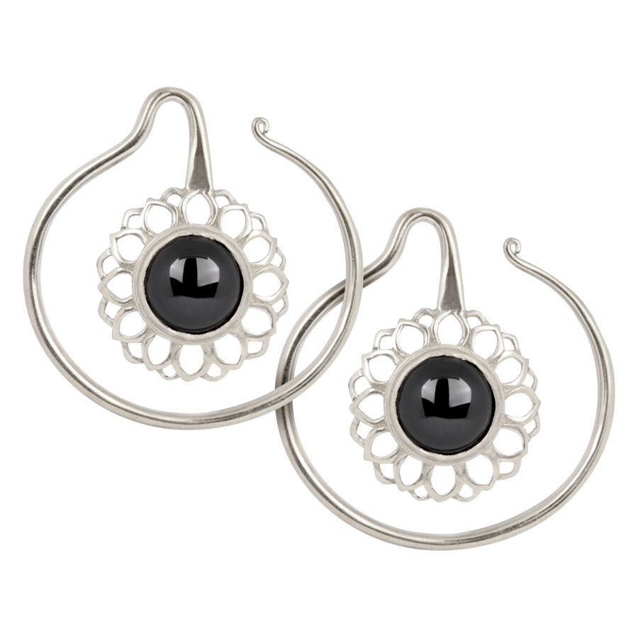 Our Whirl earweights (weights) with an onyx-like stone are elegantly processed. A small floral circle hugs the stone.