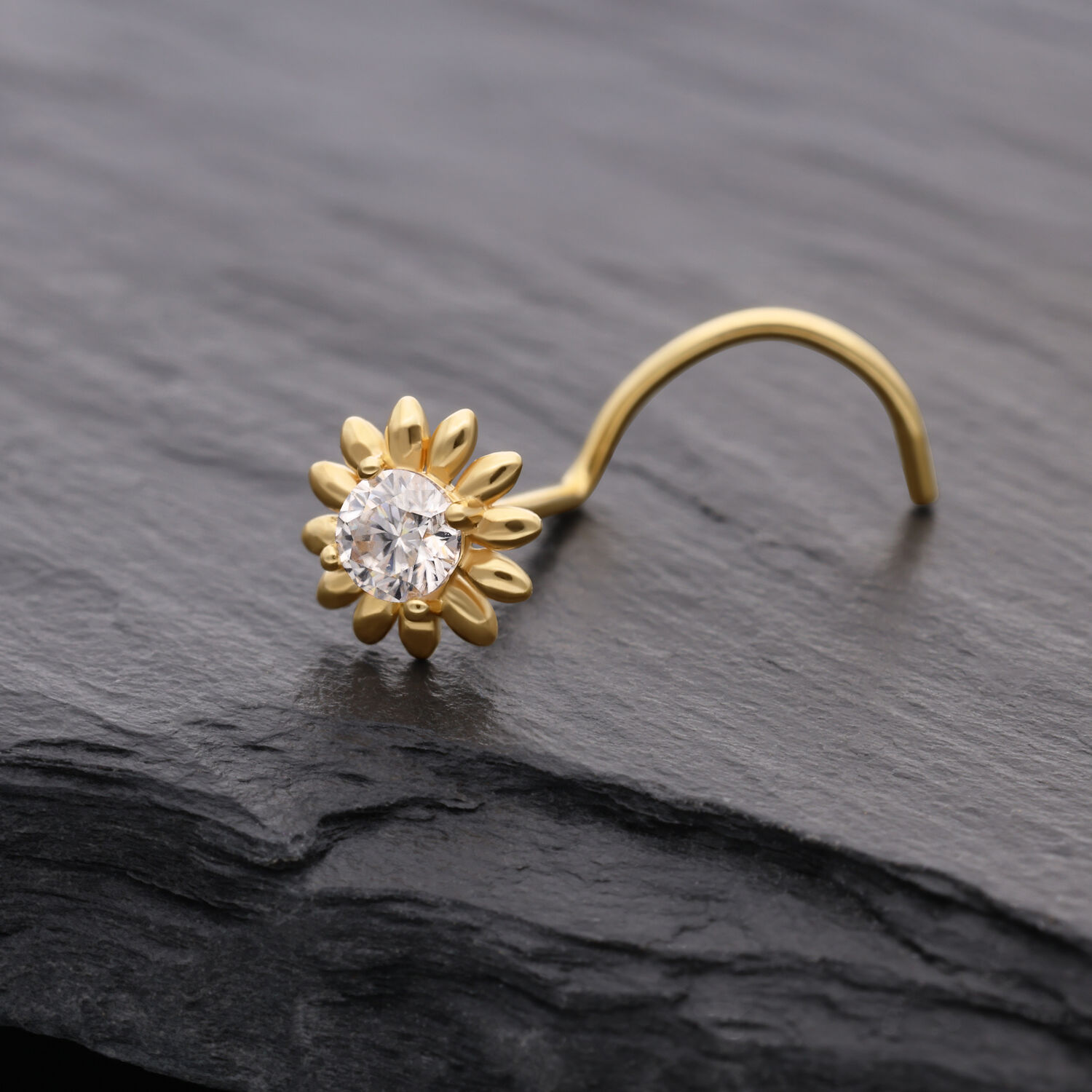 This radiant 18K Moissanite Sunflower Nose Stud combines luxurious craftsmanship with delicate design. Made from polished 18-karat (750) yellow gold, it features an intricately detailed sunflower motif that symbolizes warmth, vitality, and elegance.
