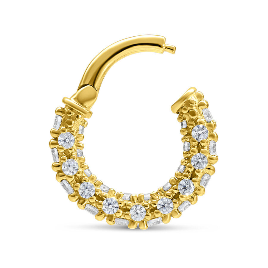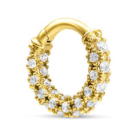 This high-quality 18-karat hinged ring is particularly striking thanks to its beautiful crystals, which will make you sparkle even from afar. The segment ring features a hinged closure, allowing for easy insertion of the piercing. This piercing is especially well-suited for helix piercings but can also be used in many other locations, such as the ear or septum.