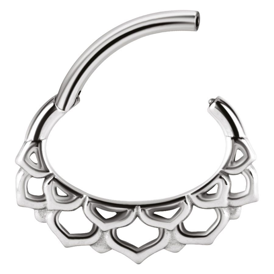 Our high-quality Blossom Clicker resembles the beautiful blossoms of a flower. It has a practical click closure, which makes it easy to open and insert the piercing jewellery. The piercing has an oval shape and a flat back. It can be used for different piercings and is best suited for your septum or smiley piercing (piercing at the frenulum). Our Blossom Hinged Ring is made of high quality silver stainless steel.