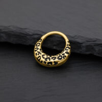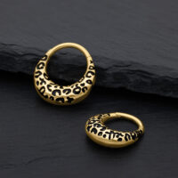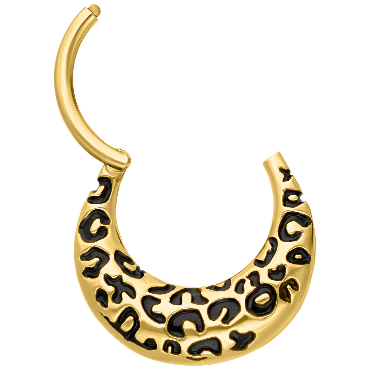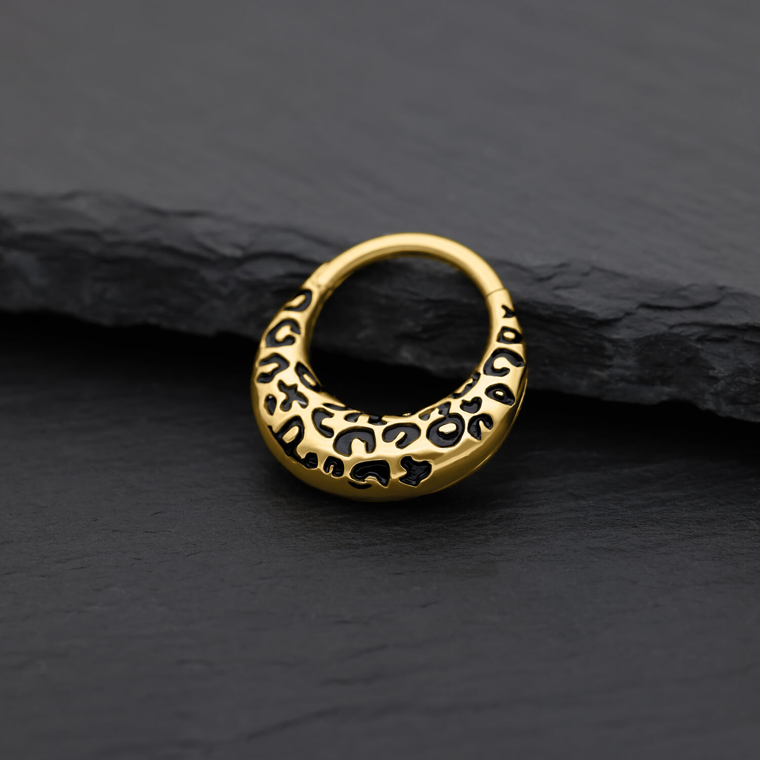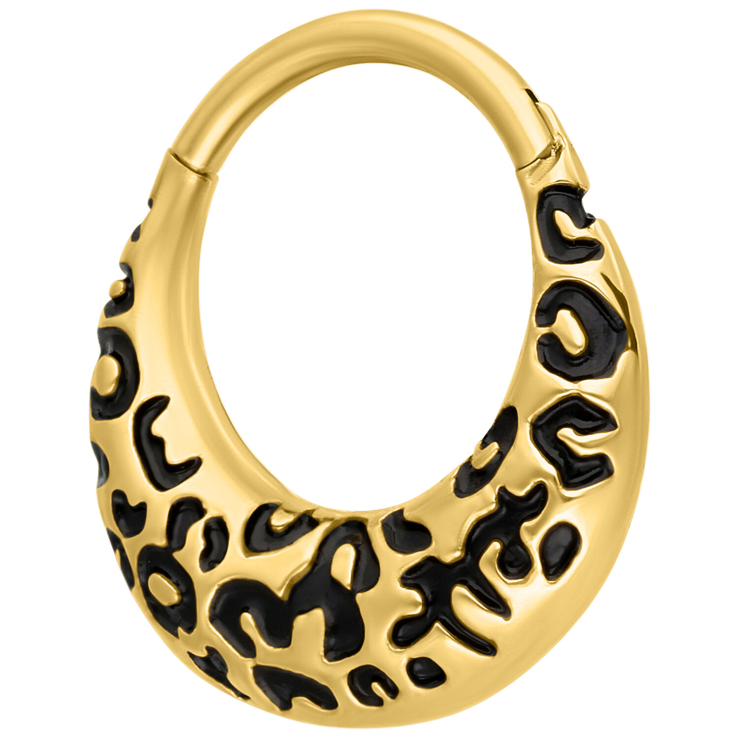 Bold, striking, and totally on trend – the Chunky Leopard Septum Clicker brings the iconic leopard pattern to life in an elegant, modern form. The deep black enamel design, paired with the gold titanium finish, gives your look a luxurious yet rebellious touch – a true statement piece for those who love to stand out.
