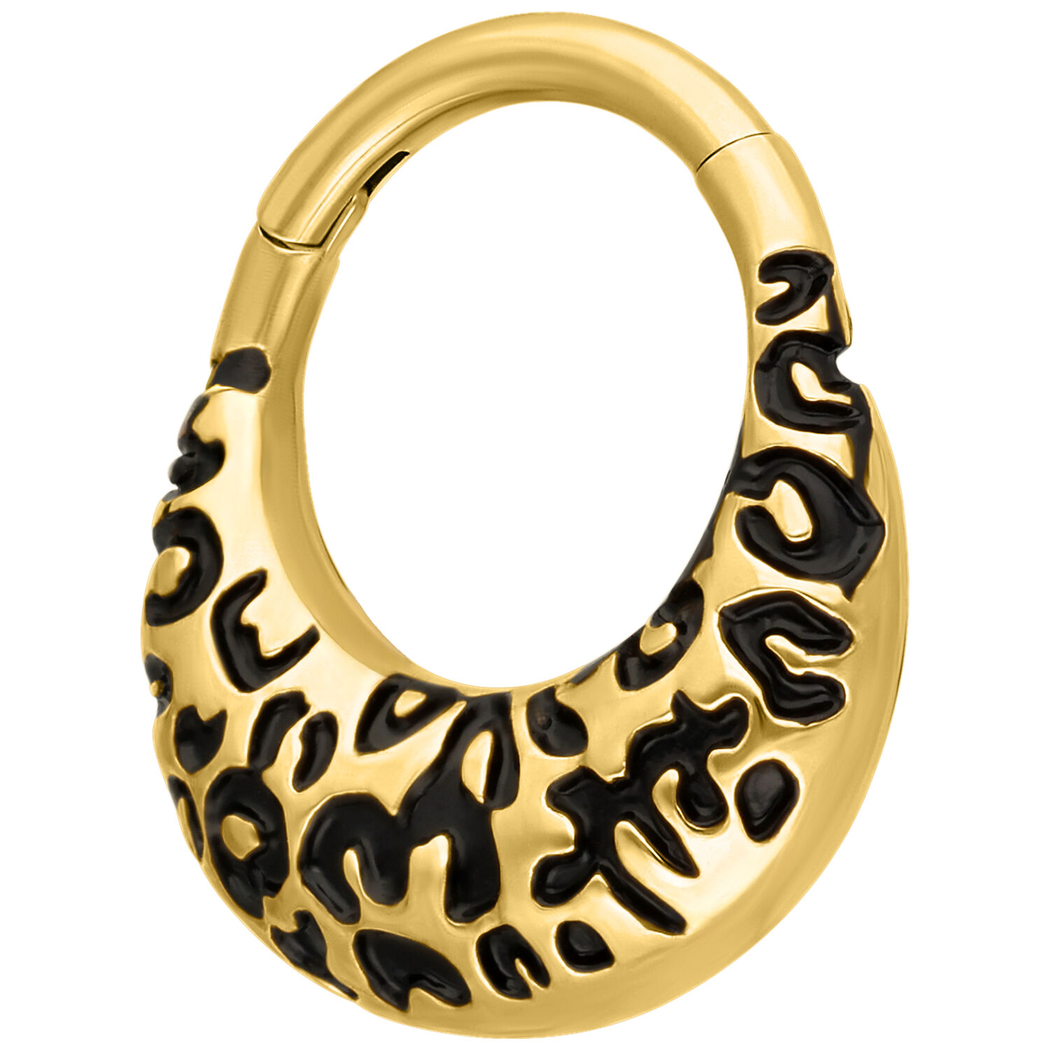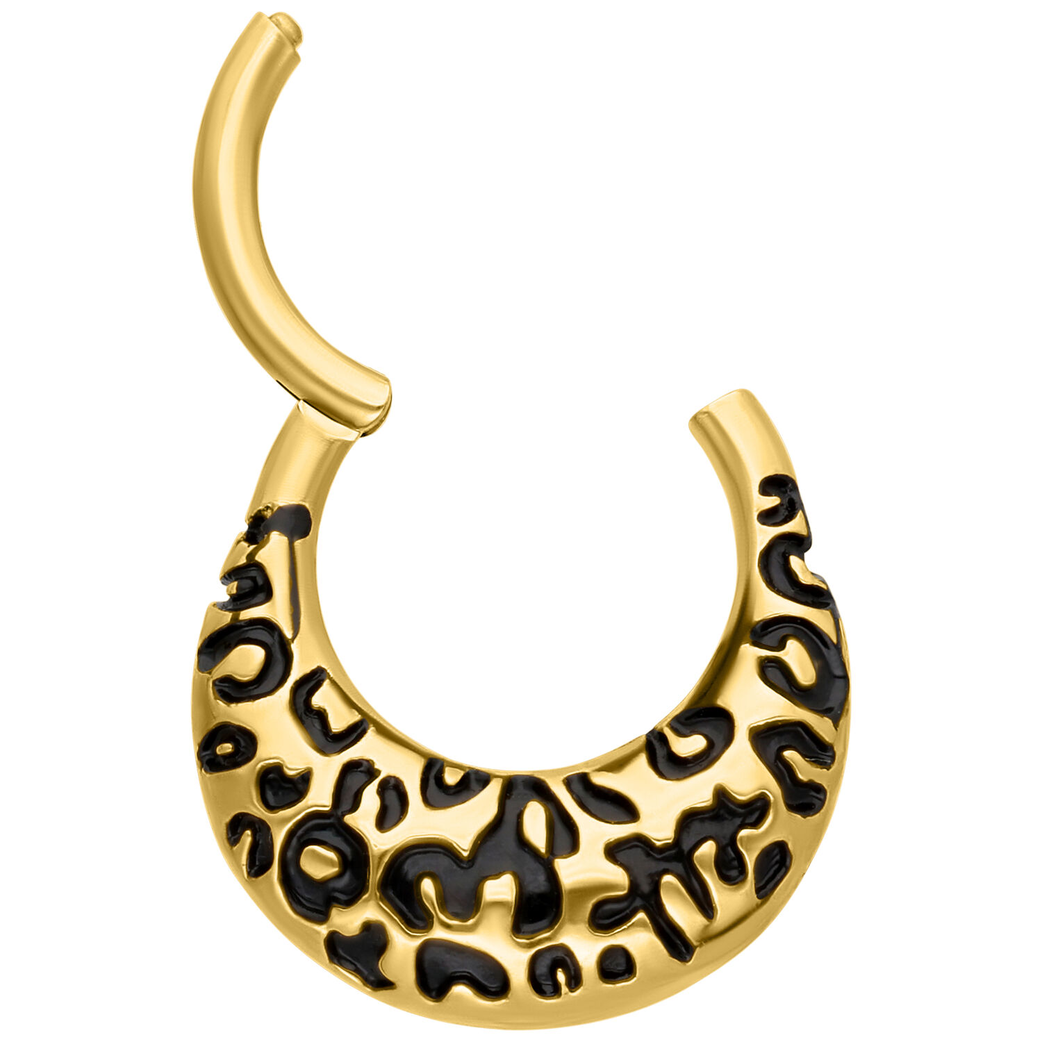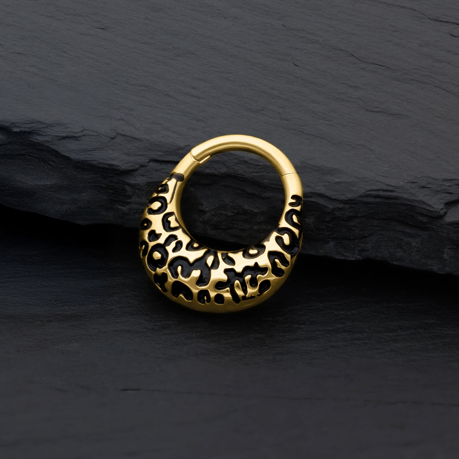 Bold, striking, and totally on trend – the Chunky Leopard Septum Clicker brings the iconic leopard pattern to life in an elegant, modern form. The deep black enamel design, paired with the gold titanium finish, gives your look a luxurious yet rebellious touch – a true statement piece for those who love to stand out.