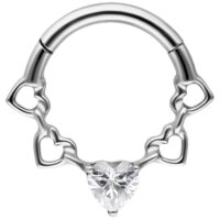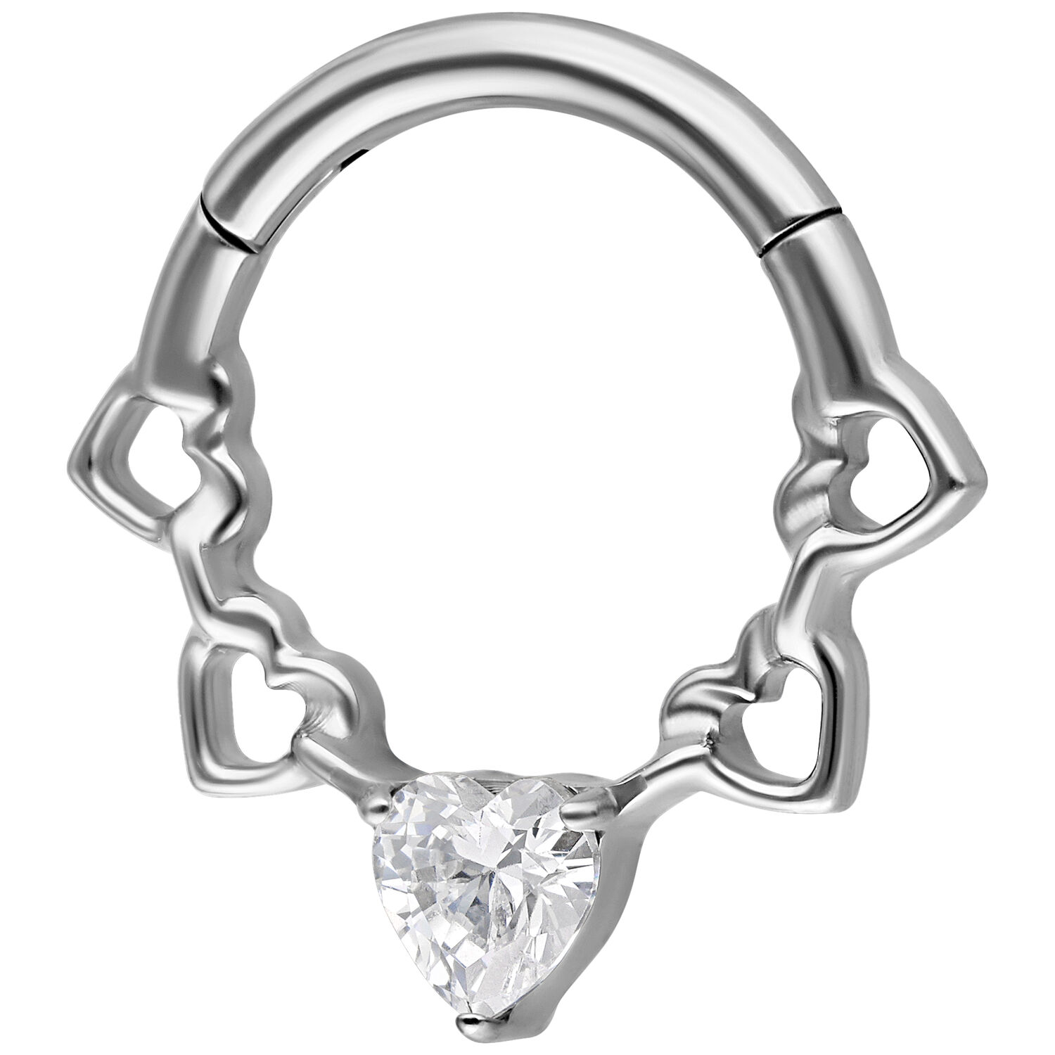 Clean design with a symbolic edge – the Crystal Hearts Septum Clicker combines precise lines with a sparkling centerpiece. The open heart details along the ring and the central heart-cut crystal create a refined and balanced look.