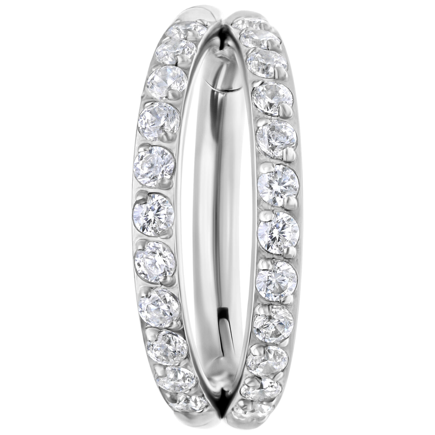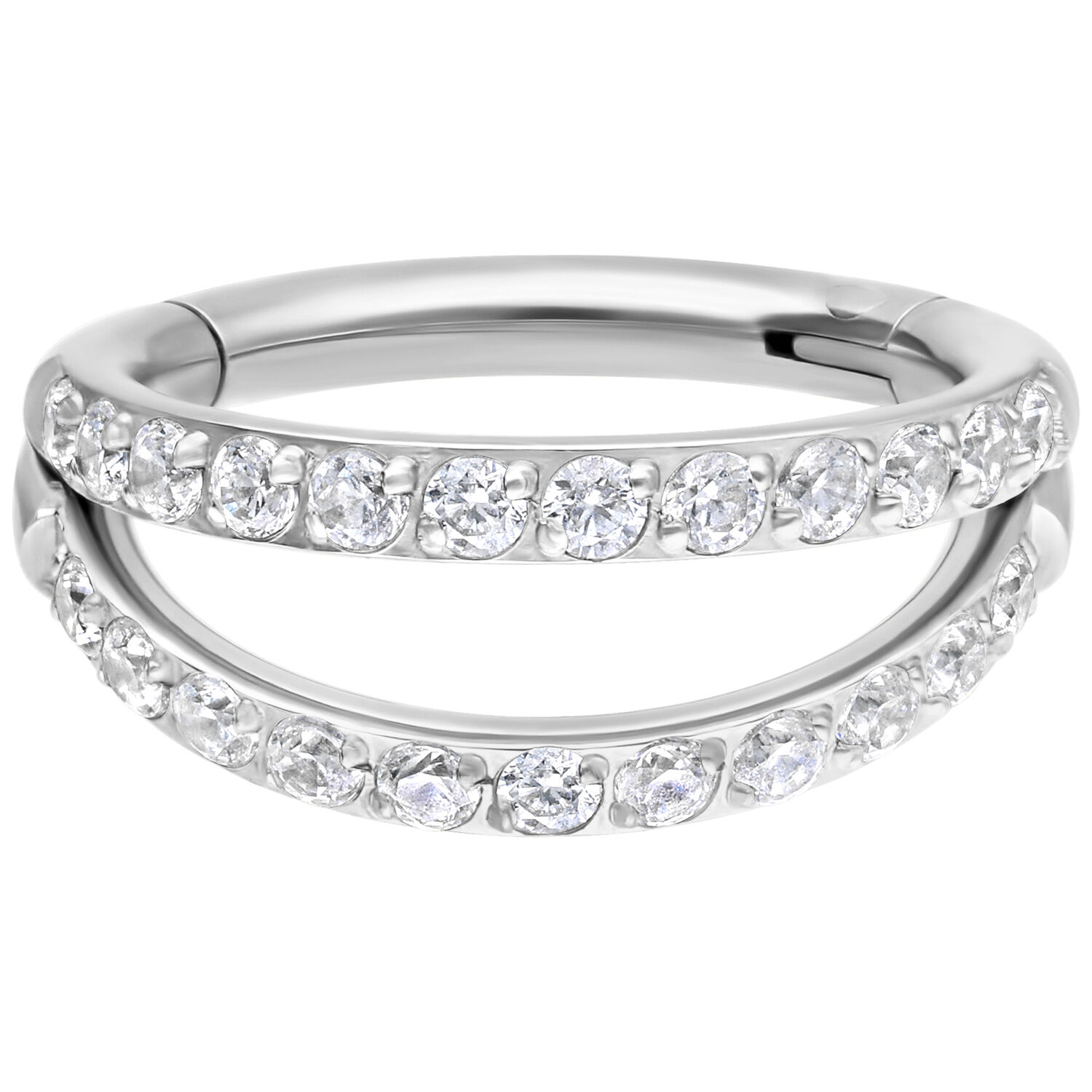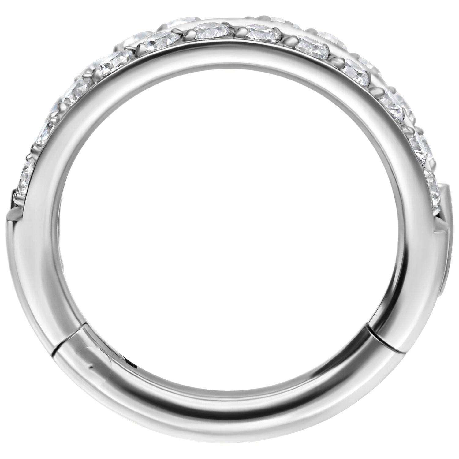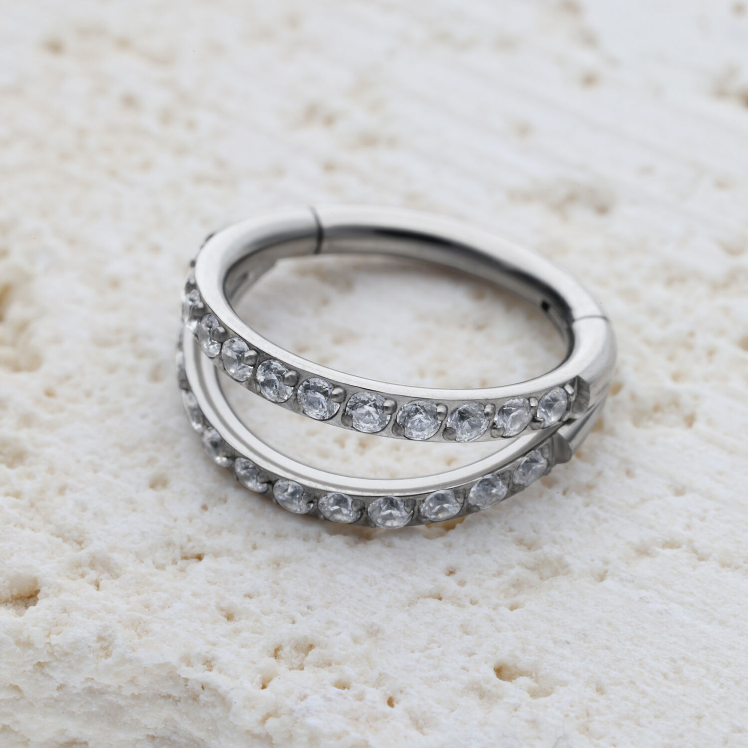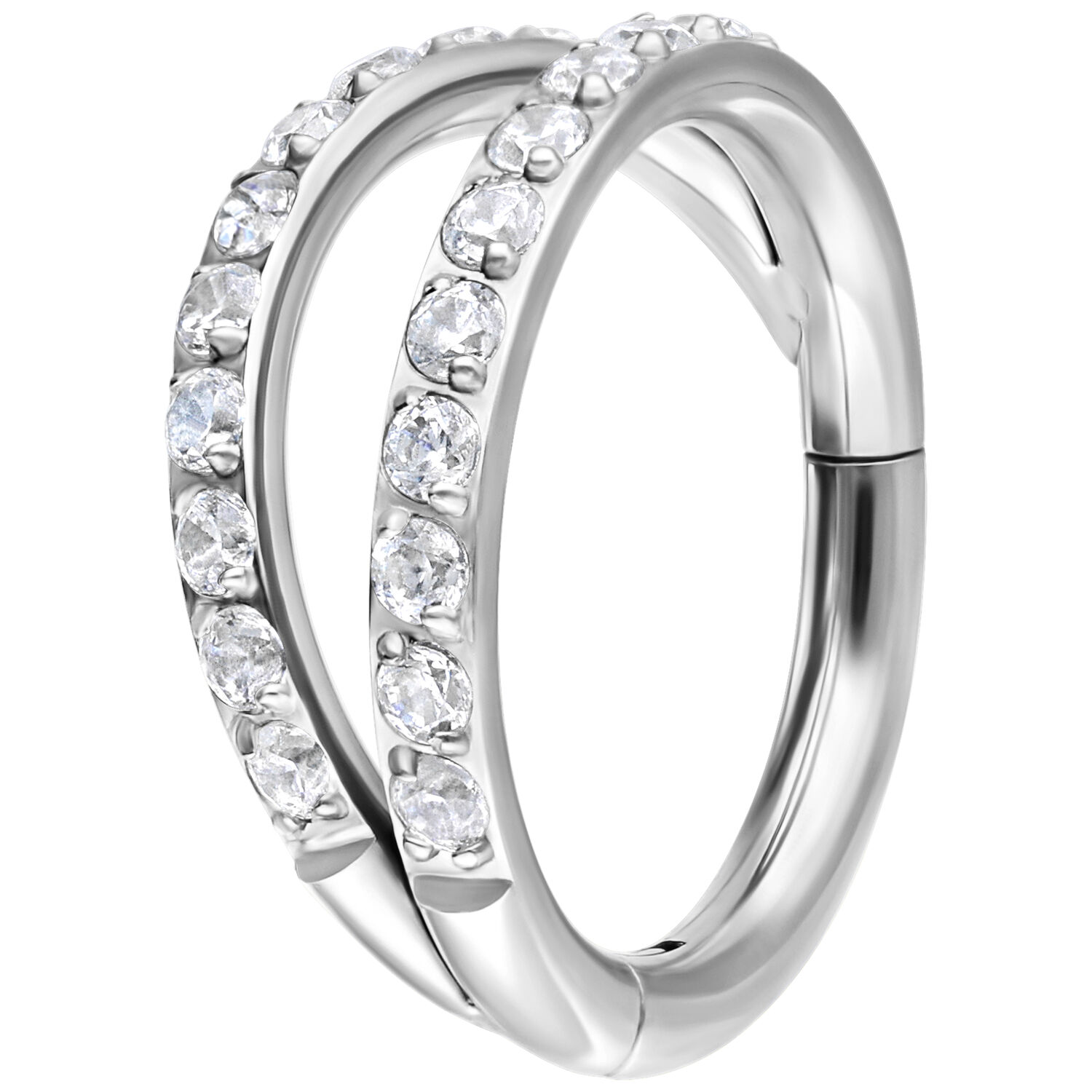Our high-quality Double Row Crystal Clicker is particularly characterized by the many shimmering crystals that make it a real eye-catcher. Let your creativity run wild, as you can use this ring for almost any piercing. It is especially suitable for your septum, lobe, or helix piercing. Thanks to its hinged closure, it’s super easy to change your piercing without any help. Reinvent yourself!
