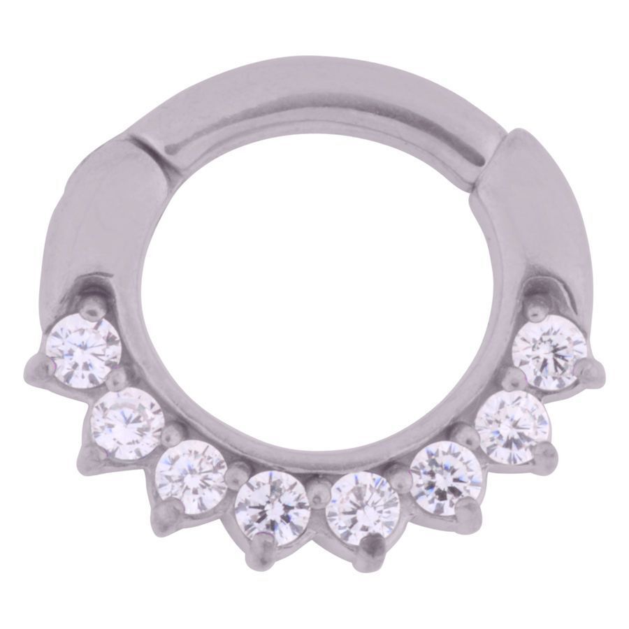 This high-quality glamorous clicker made of silver stainless steel stands out especially because of its beautiful stones that make you shine even from a distance. The segment ring has a hinge closure that makes it easy to insert the piercing. The piercing is particularly suitable for your septum piercing, but can also be worn on the ear or on the lip band (smiley). The stones have a size of approx. 1.2 mm.