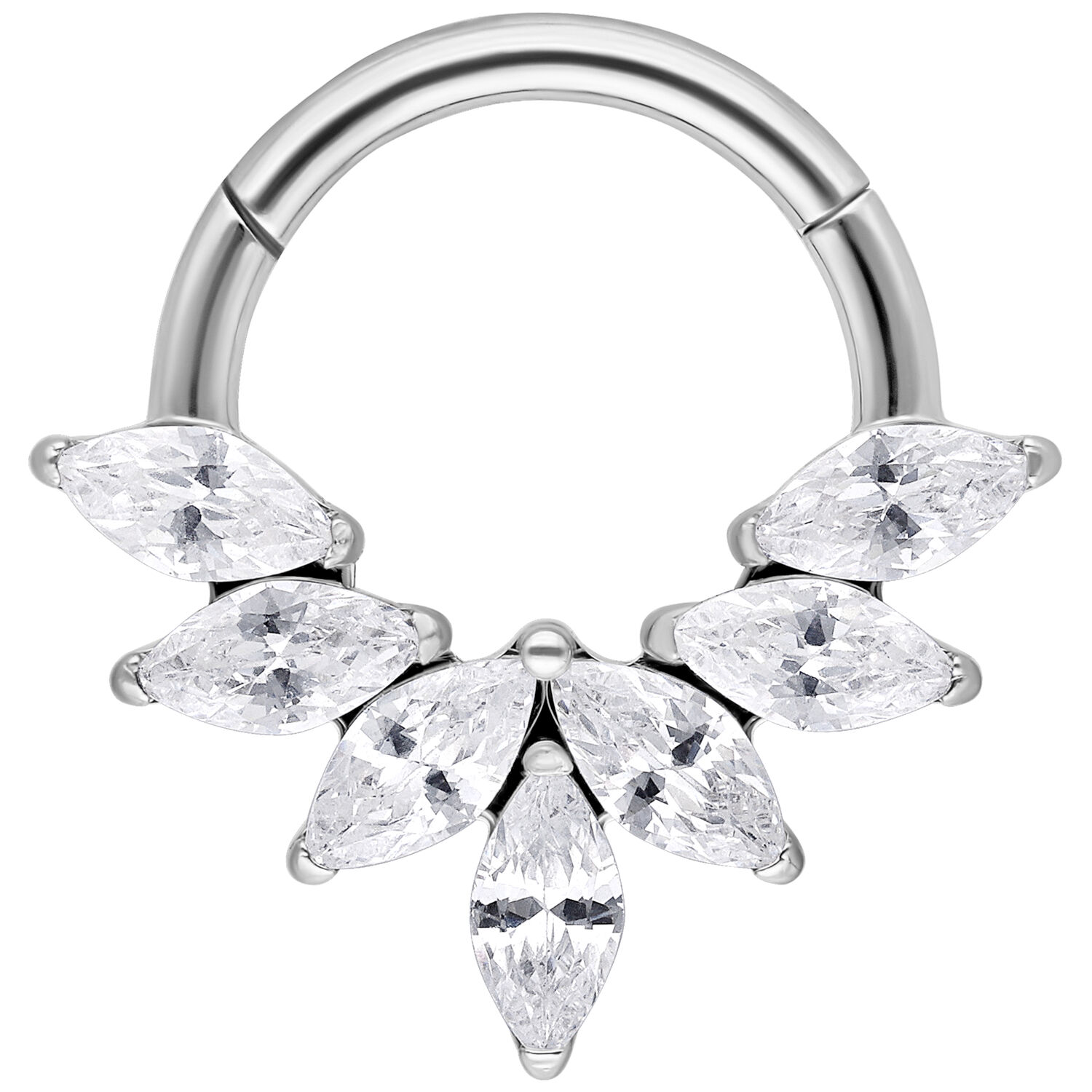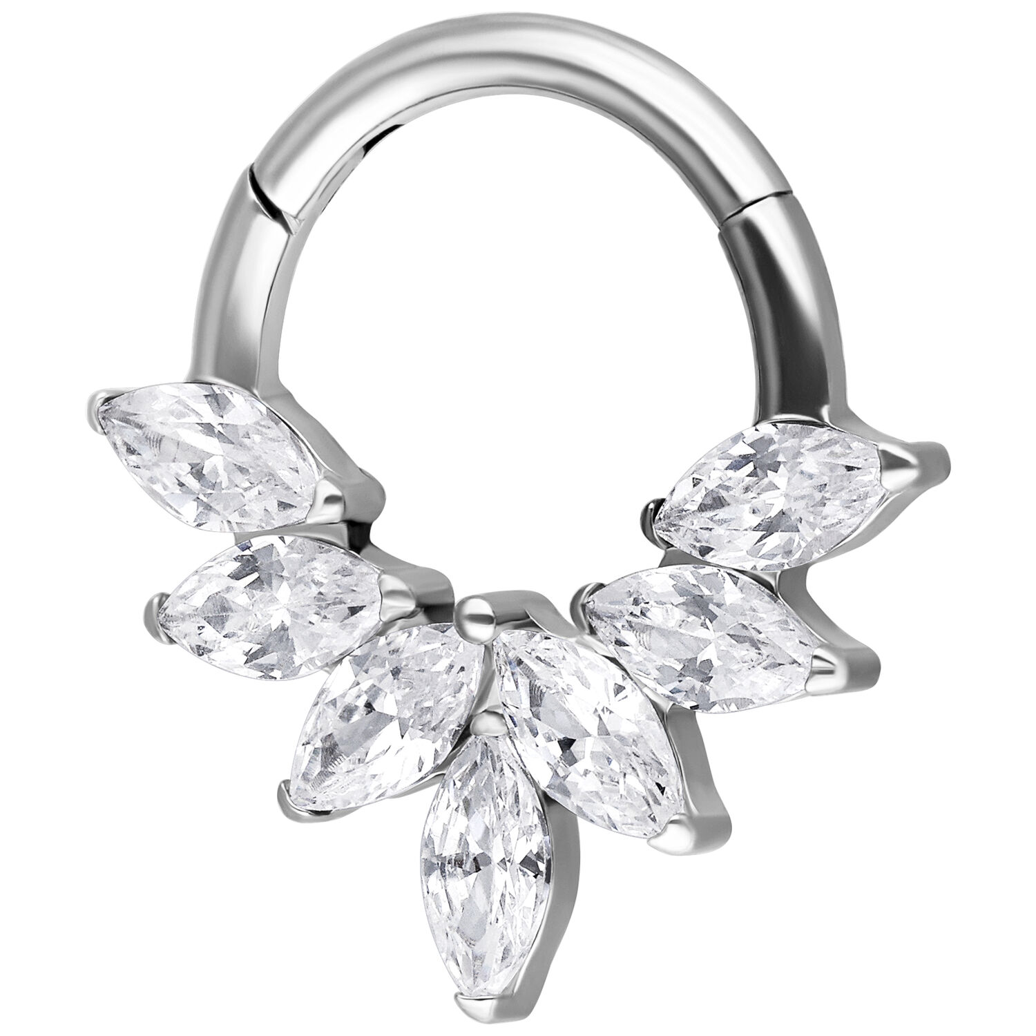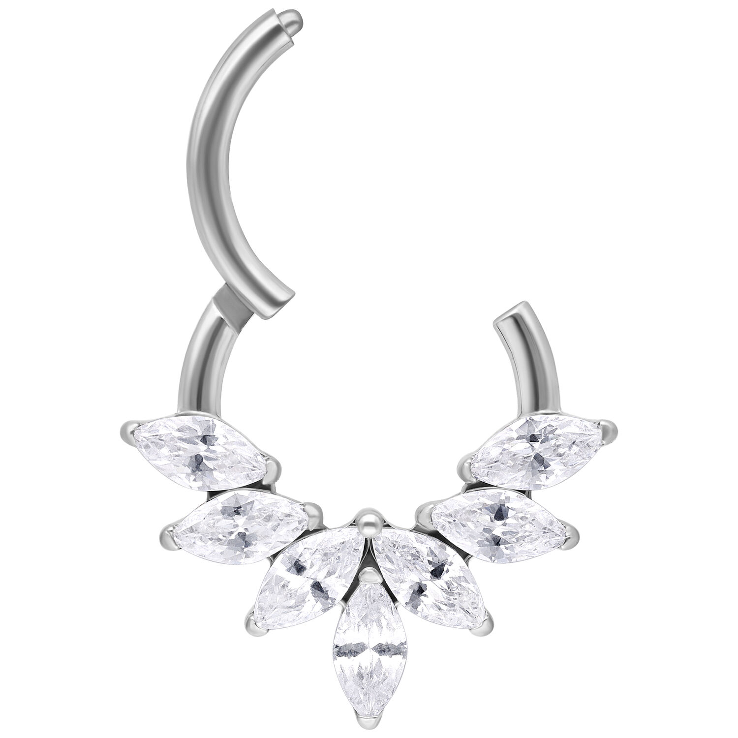 Titanium offers lightweight comfort, excellent skin compatibility and long-lasting durability. Featuring a secure and easy-to-use clicker mechanism, this ring is perfectly suited for septum and daith piercings. The Marquise Crystal Fan Clicker adds a sophisticated touch of brilliance to both everyday and elevated styles.