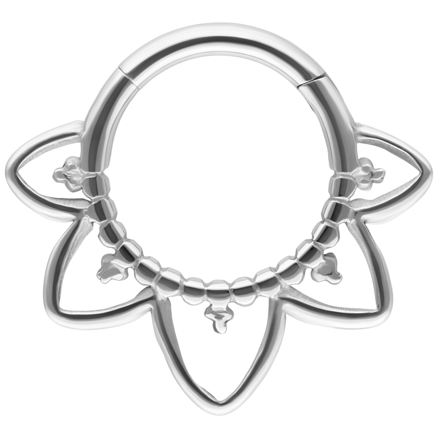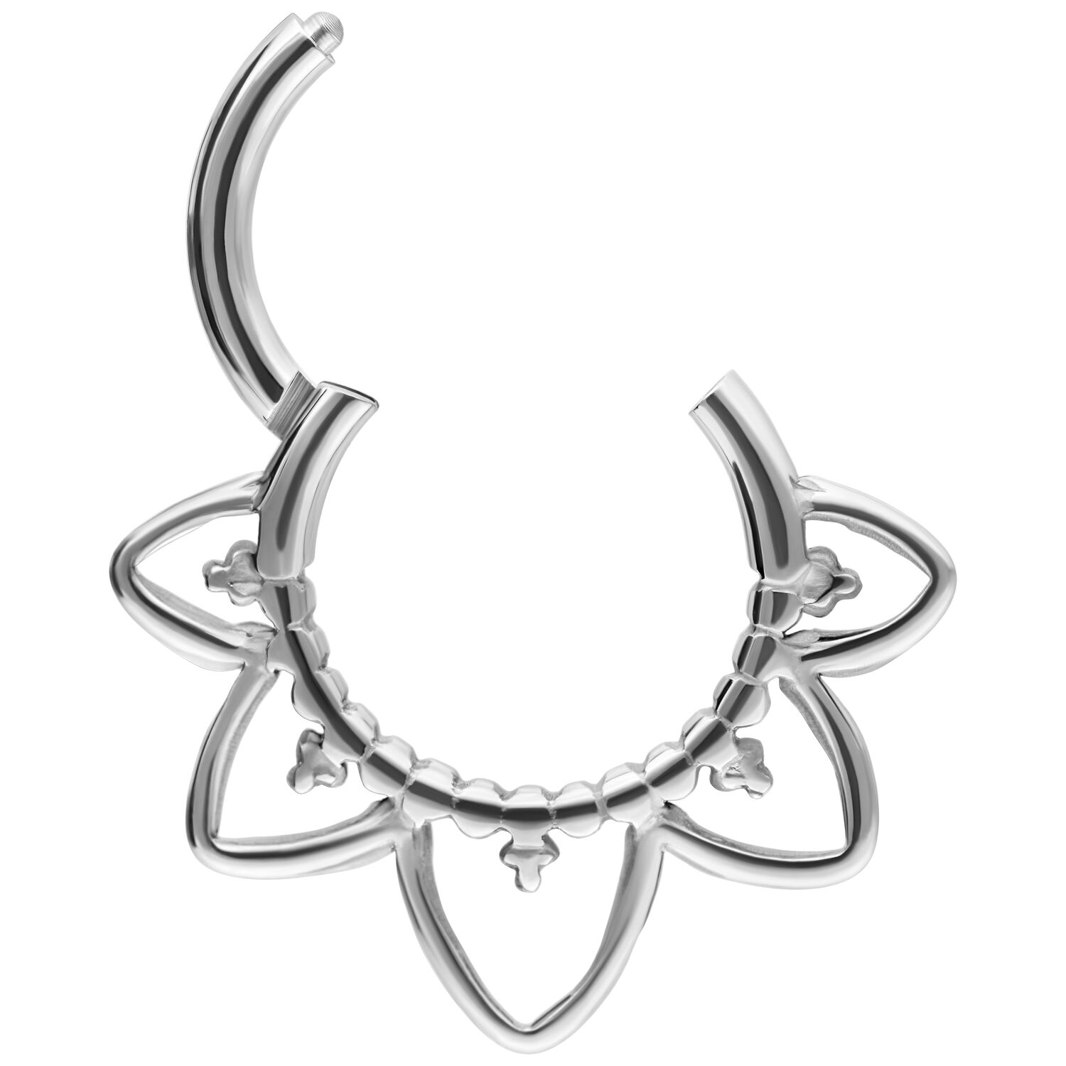 Our Oriental Septum Clicker is made of high-quality titanium and is perfect for your septum or even Daith piercing. The piercing features a curved hinge bar, making it easy to handle when inserting the piercing – all without the need for assistance.