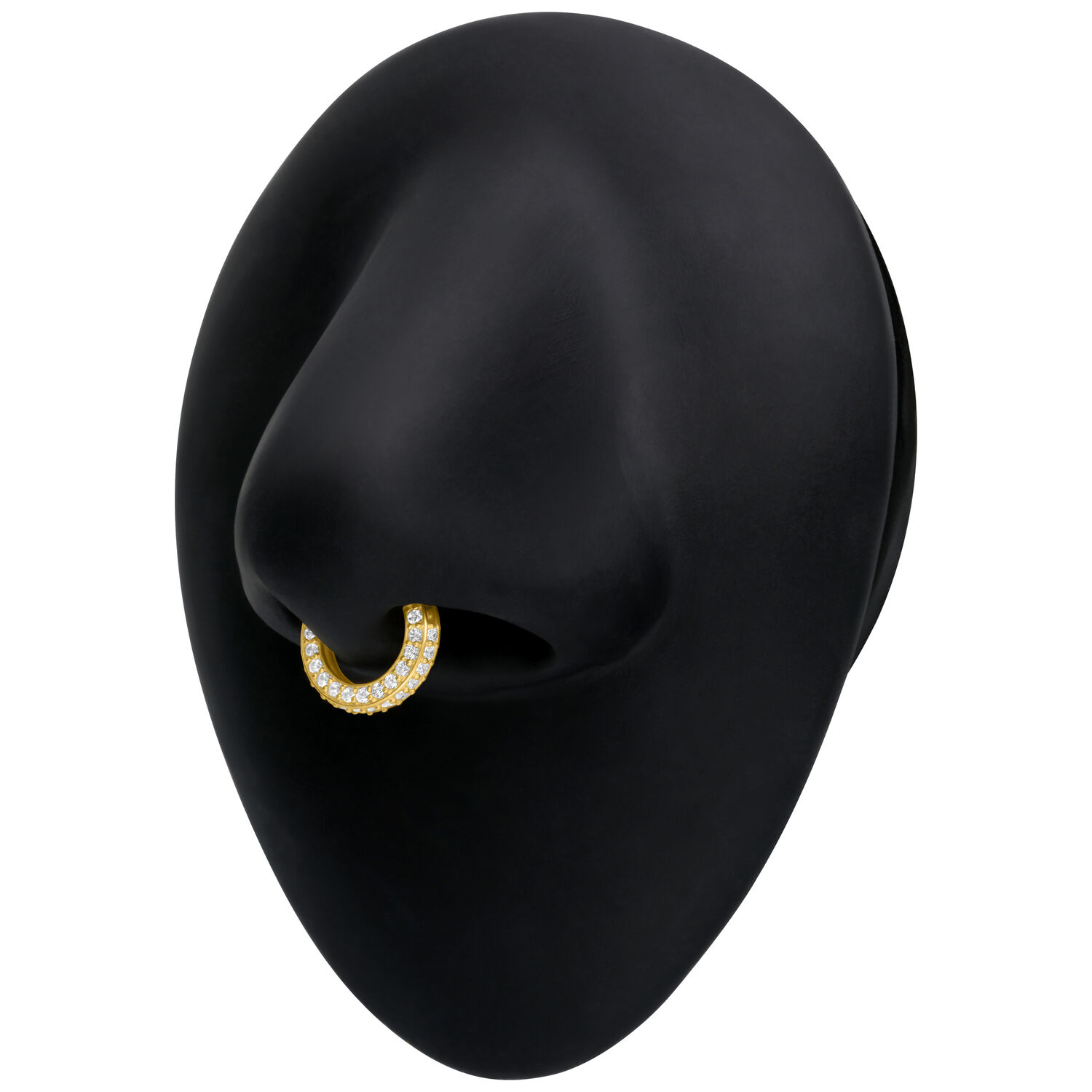 This high-quality 18 carat hinge ring is particularly striking because of its beautiful crystals that make you shine even from a distance. The segment ring has a hinge closure that makes it easy to insert the piercing. The piercing is particularly suitable for your helix piercing, but can also be used in many other places, for example on the ear or for your septum. The stones have a size of approx. 1.0 mm.