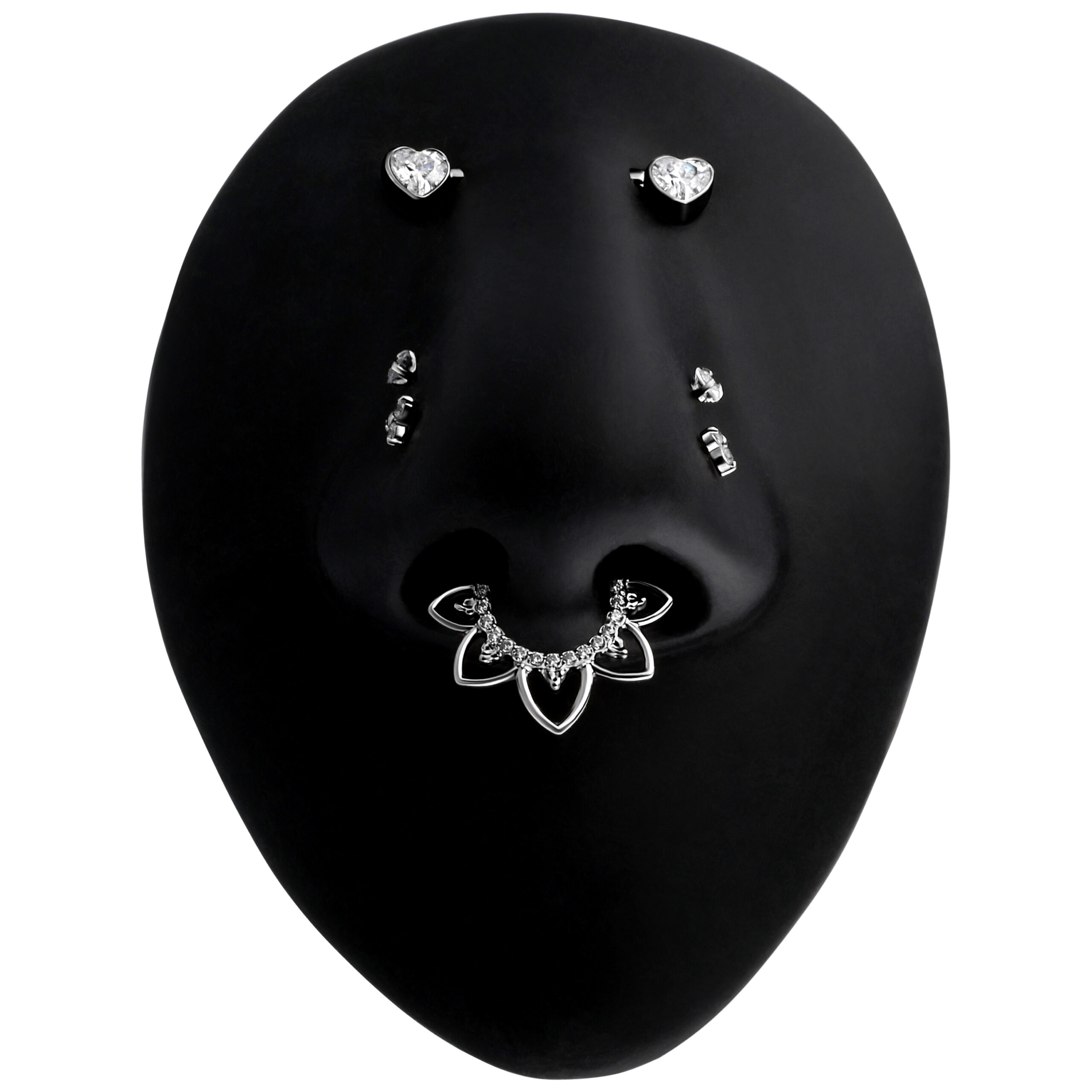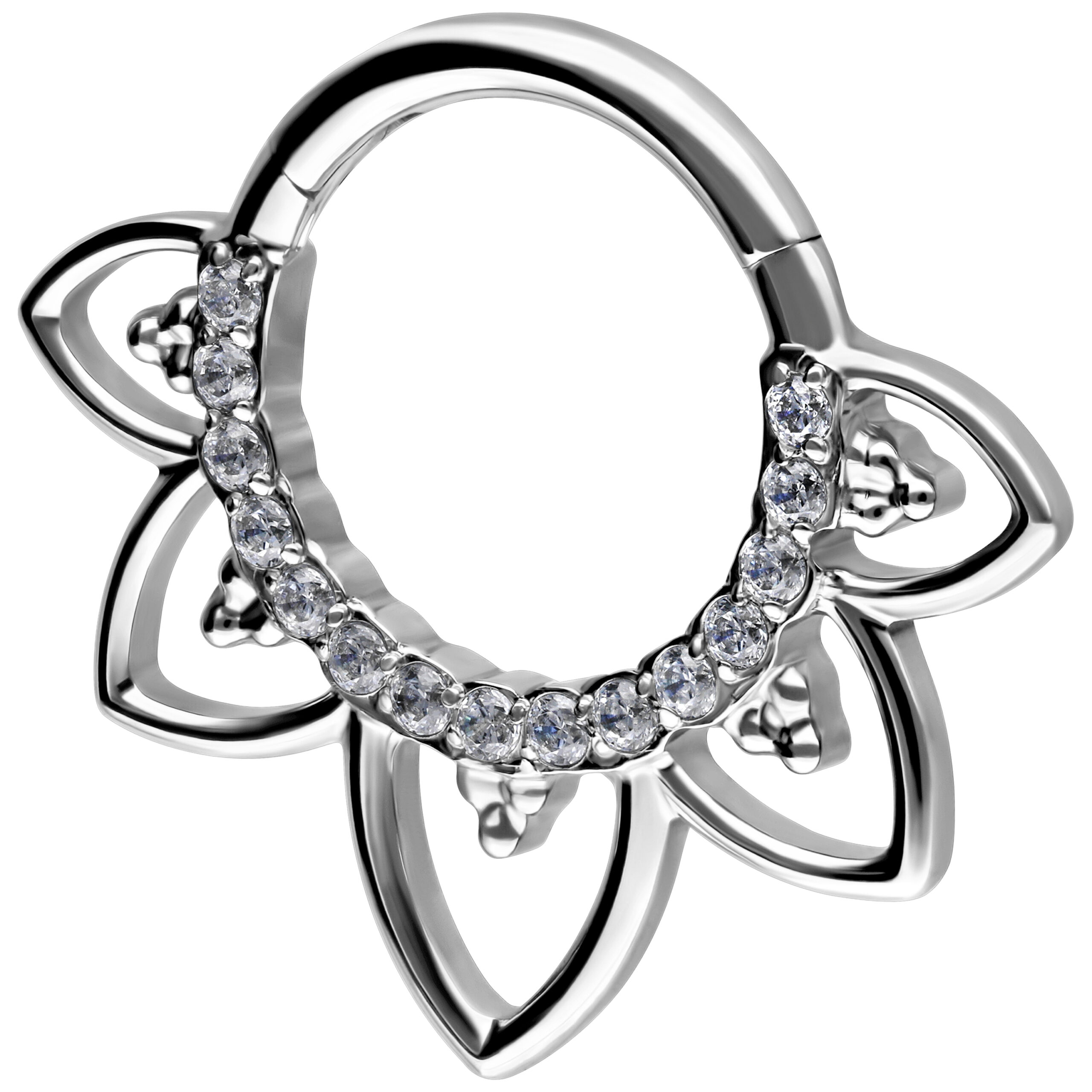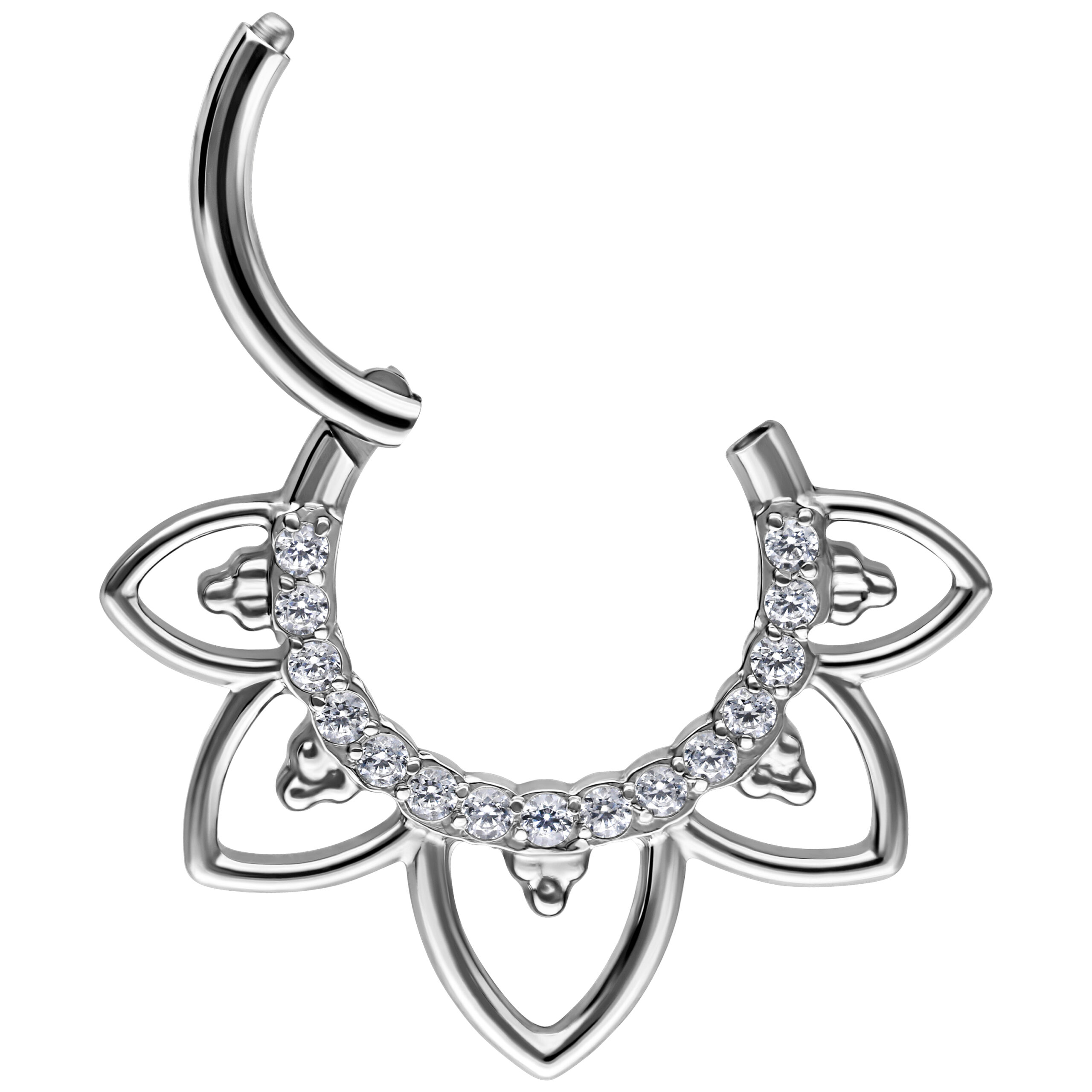 Our Oriental Crystal Septum Clicker is made of high-quality stainless steel and is ideal for your septum or Daith piercing. The piercing features a curved hinge bar that allows for easy handling when inserting the piercing – all without the need for assistance.
