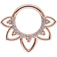 Our Oriental Crystal Septum Clicker is made of high-quality stainless steel and is ideal for your septum or Daith piercing. The piercing features a curved hinge bar that allows for easy handling when inserting the piercing – all without the need for assistance.