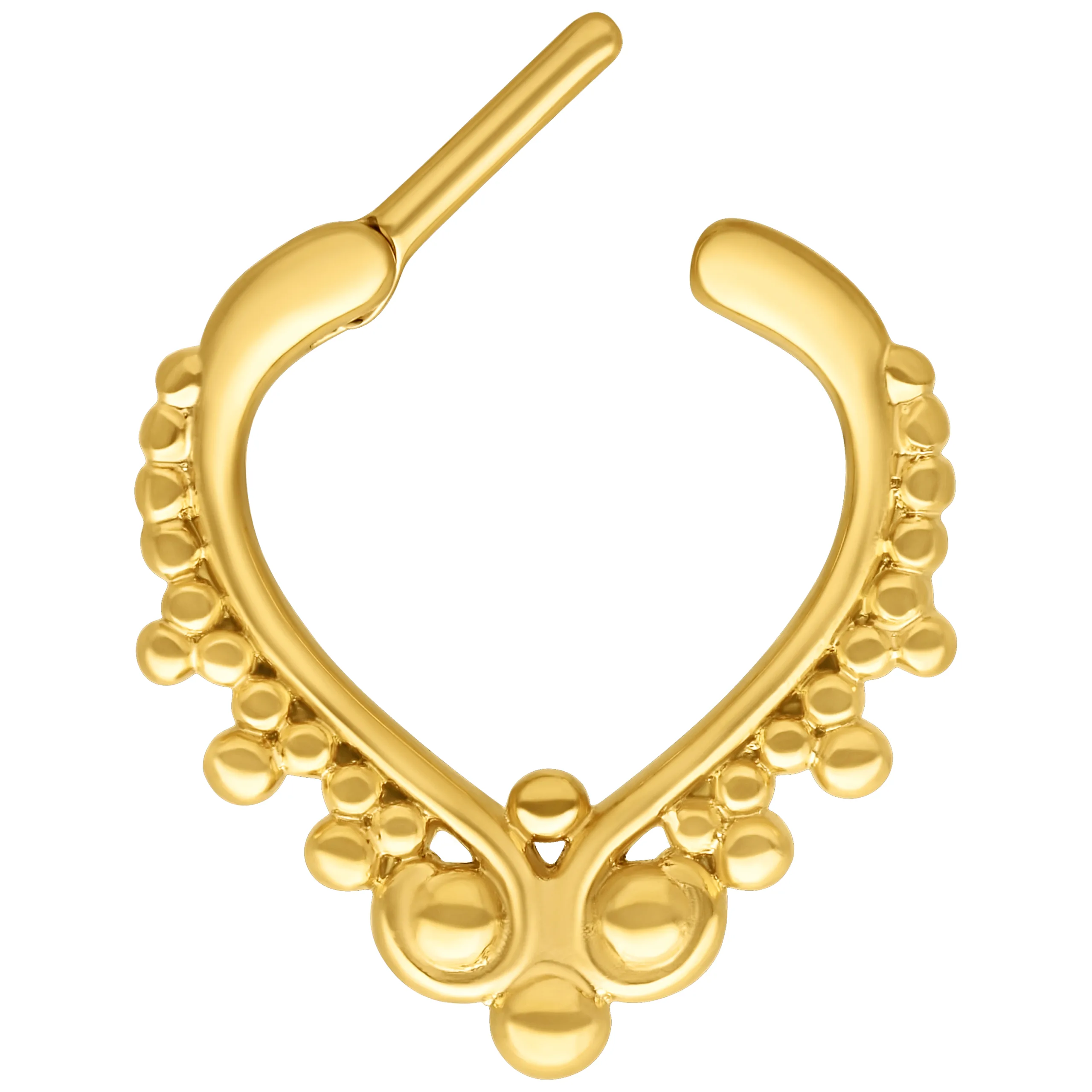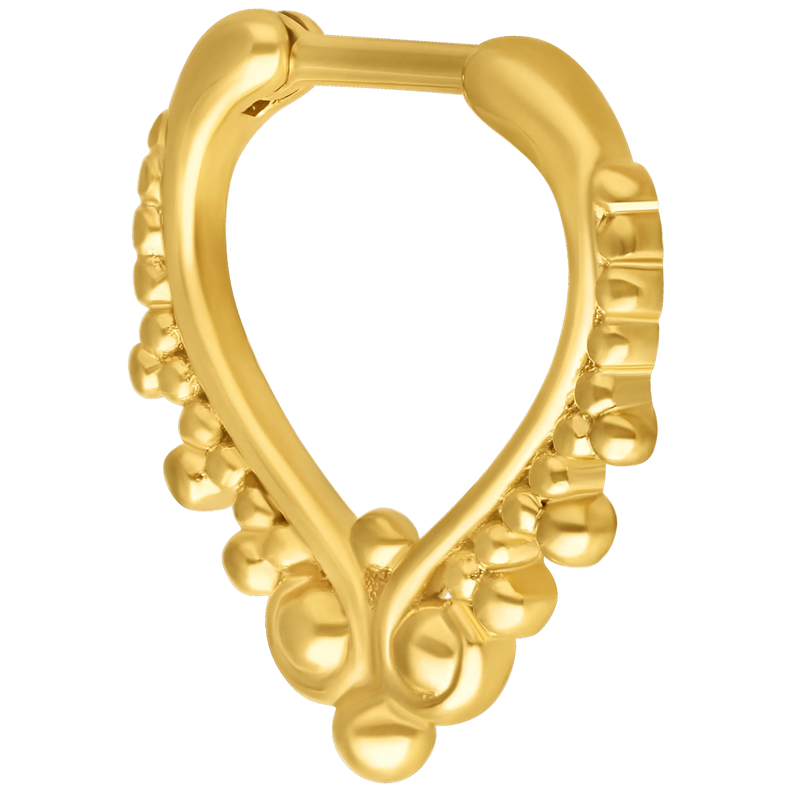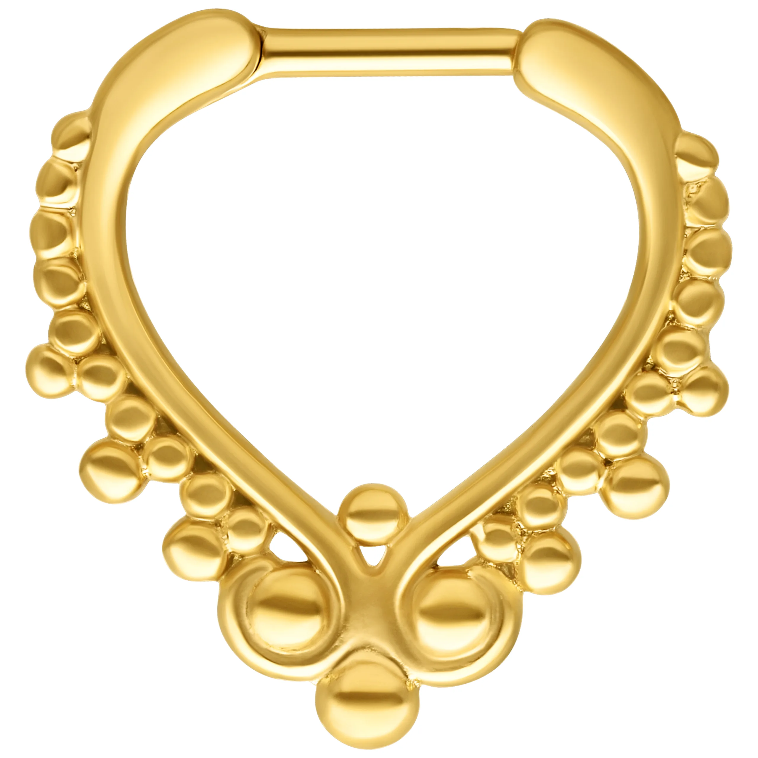 Our Wonderland Septum Clicker has a fantastically beautiful and unique design. The piercing has a little touch of the Orient, and in addition the golden colour makes it an absolute eye-catcher! The septum piercing has a straight hinged steel bar made of stainless steel with a length of approx. 6.0 mm. Thanks to its click closure, the piercing is super easy to open and insert. Alternatively, the piercing can also be used for your daith piercing, for example.