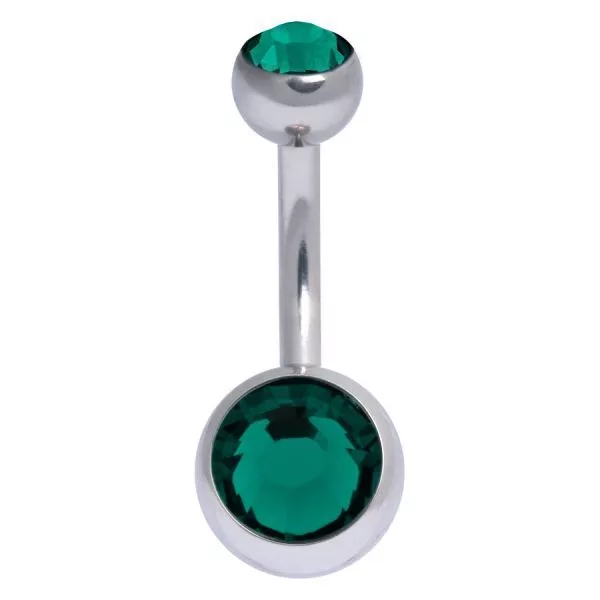 Titanium Highline® Internally Threaded Double Jeweled Bananabell The Titan Highline® Internally Threaded Double Jeweled Bananabell is available in lengths of 8.0, 10.0 and 12.0 mm including a large ball (8.0 mm) and a small ball (5.0 mm). Both balls are decorated with a noble crystal.